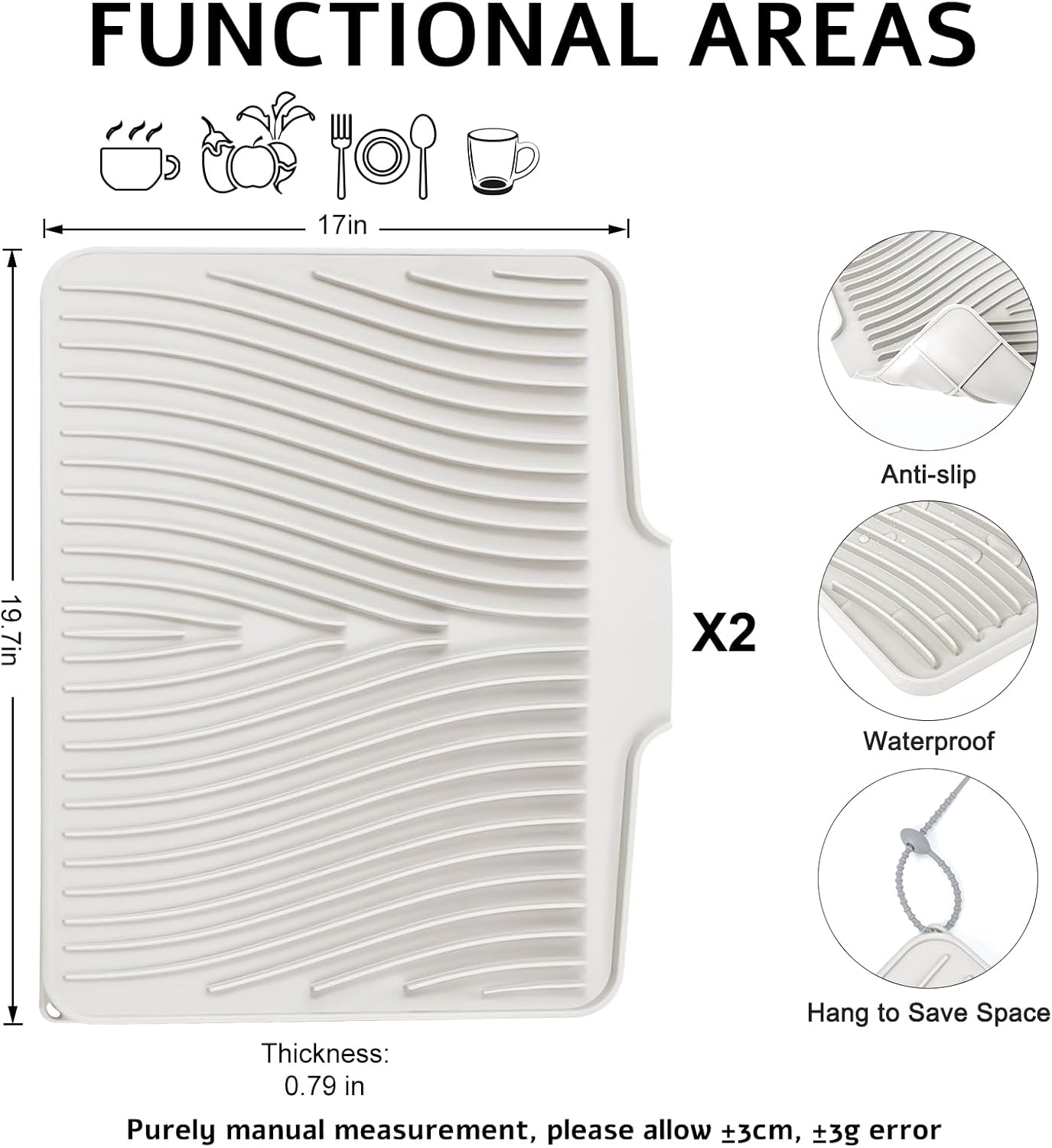 - Fast Dish Drying Mat: The TIKNIK 2-Piece Set includes two dish drying mats for kitchen countertops, measuring 19.7" x 17" x 0.59" (L x W x H) The kitchen drying mat features innovative ridges and unique diagonal ridges that allow air to circulate under dishes to remove moisture easily. The unique high sidewall rim prevents water from leaking out, allowing it to drain directly into the sink and keep your countertops dry.