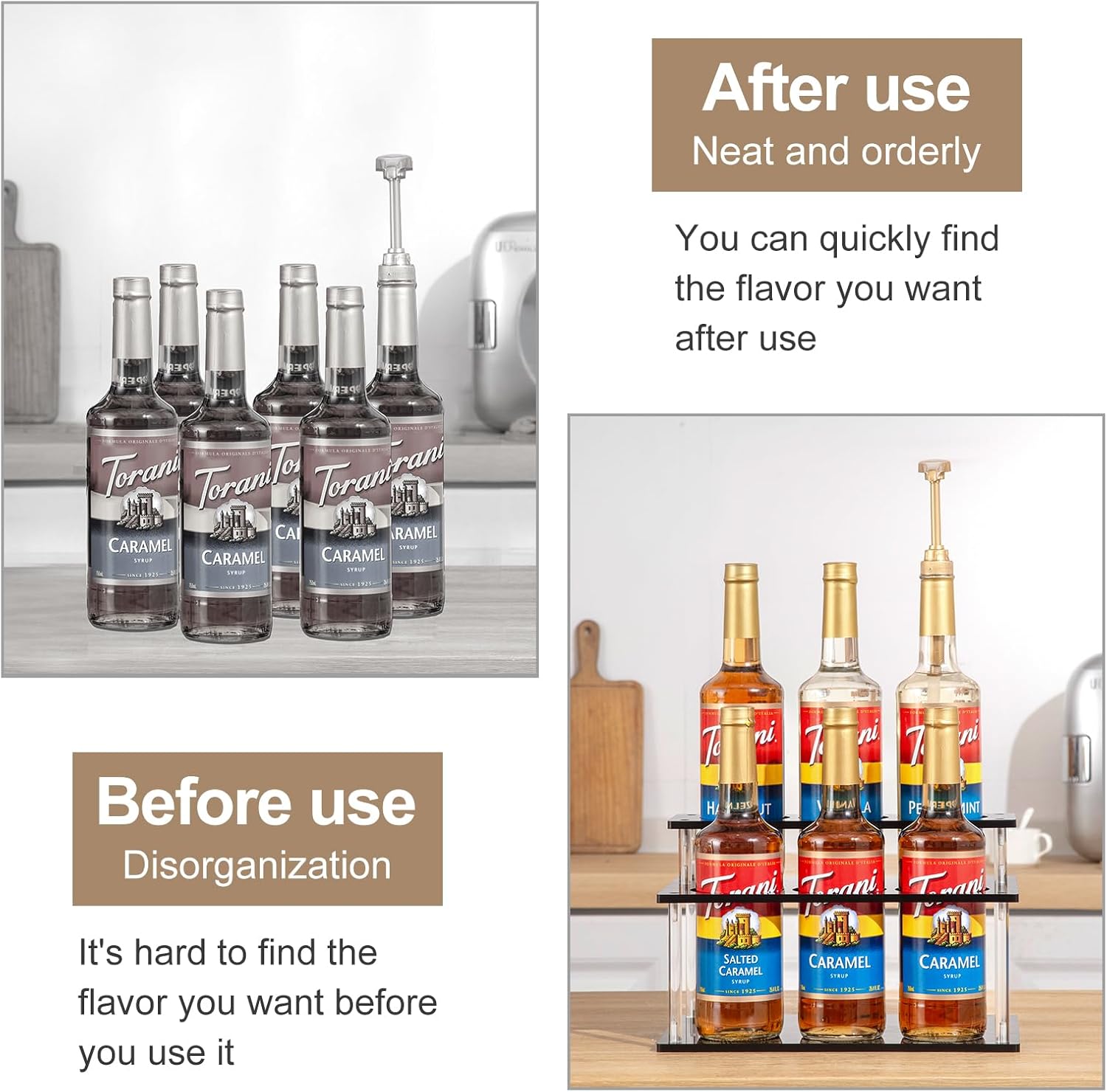 - Sturdy & Easy Access: This small syrup rack is made of high quality clear acrylic, strong and stable material that ensures the longevity of the syrup bottle holder. Location circle features can hold the syrup bottles securely and prevent them from falling or breaking. Even when fully loaded, the 2-tier syrup rack can be effortlessly lifted and moved to another position. Simply press the syrup pump on the rack for easy access.