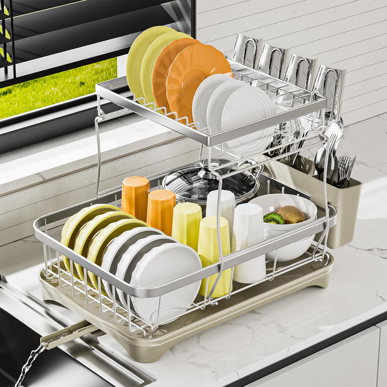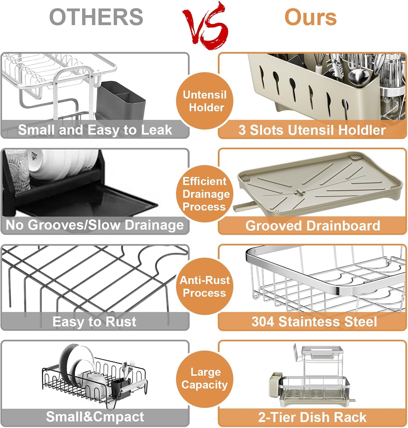 - High Quality & Thoughtful Design: Dish drying rack for kitchen counter is made of 304 stainless steel and is carefully polished to ensure the dish rack with drain is beautiful and high-quality. All corners are rounded and polished to avoid scratches and damage to items