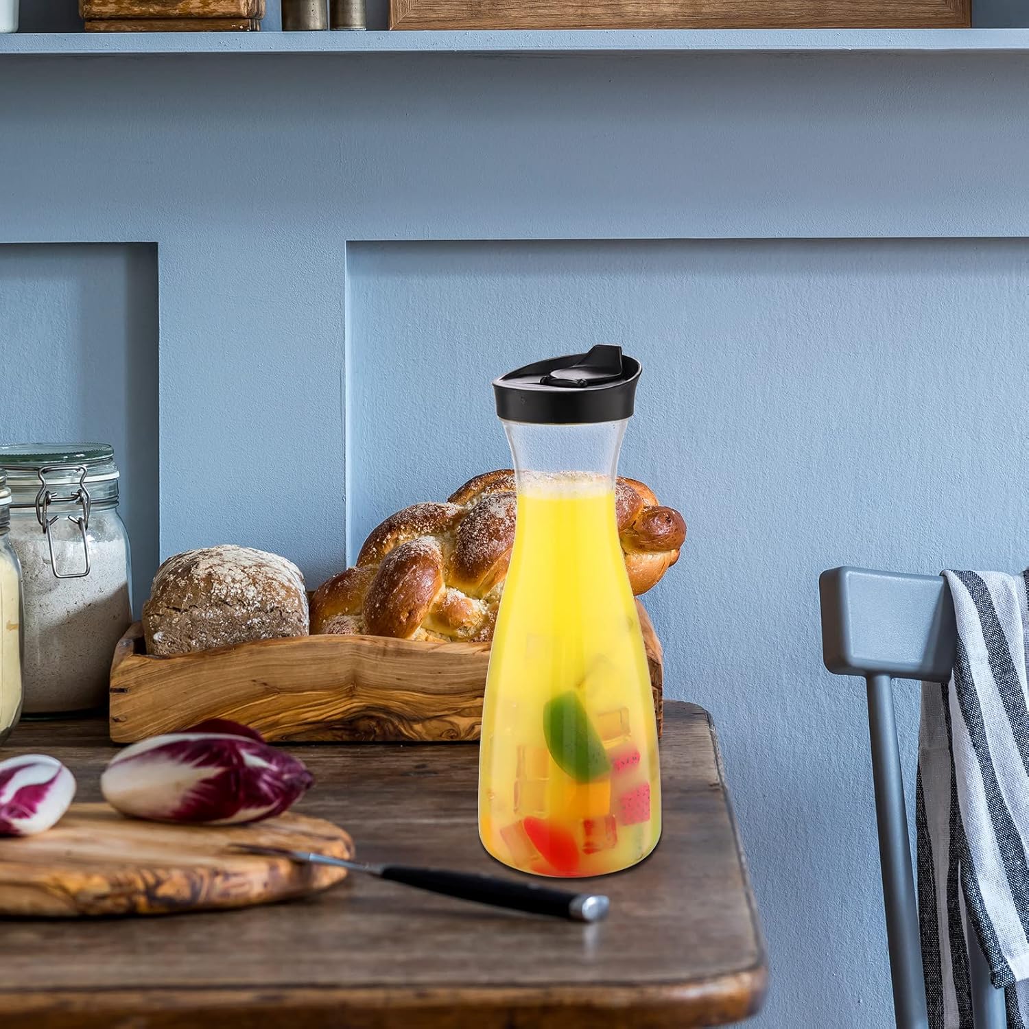 - Quality Water Bottle with Lid: the round carafe beverage containers with black lid are made of PC, and the lids can prevent leaks and spills, easy to open and close, the black screw cap keeps large ice cubes in carafe when pouring