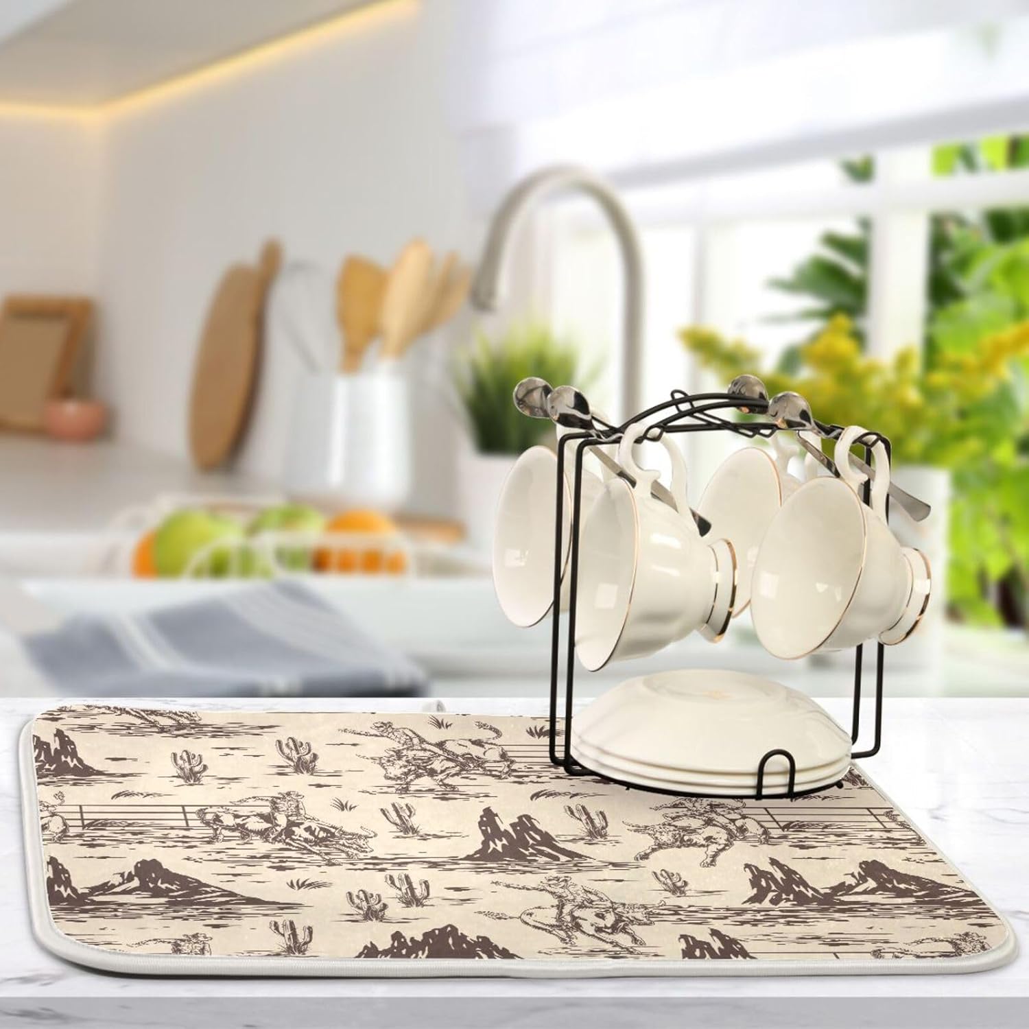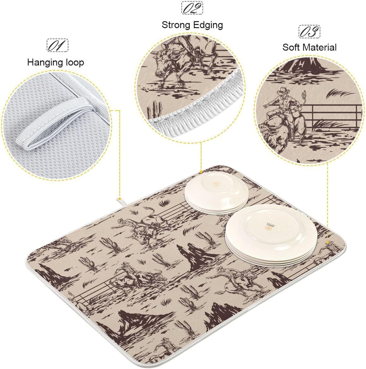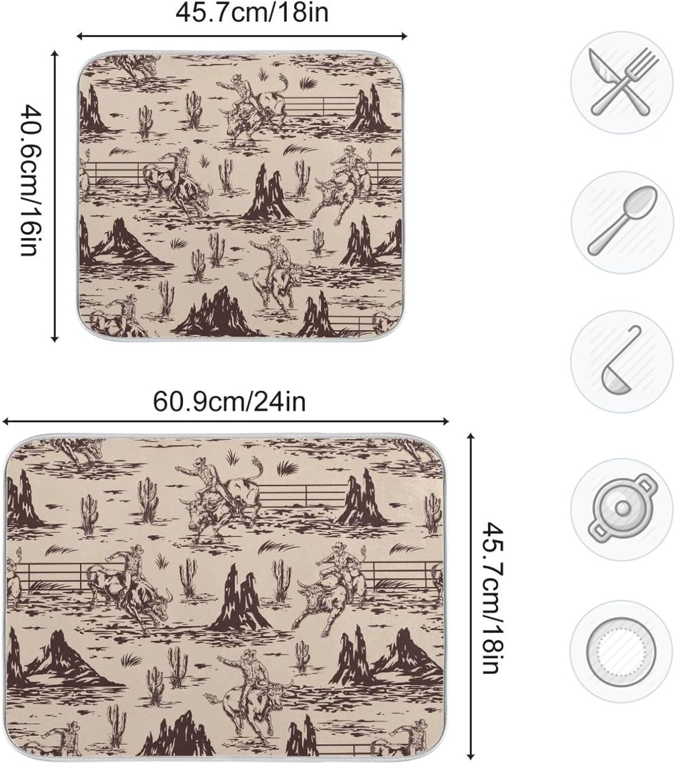 West Cactus Cowboy Dish Drying Mat for Kitchen Counter Absorbent Microfiber Drying Pad, Medium 16x18 in, Reversible Drainer Mats