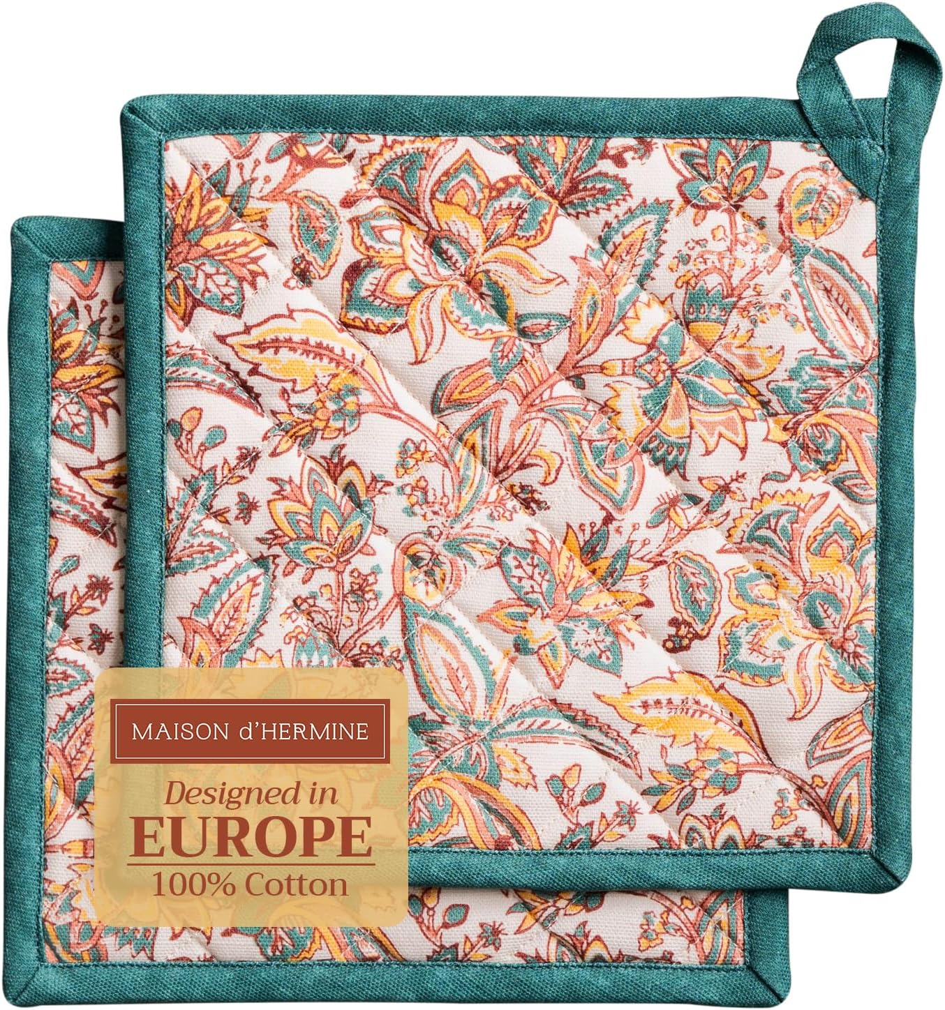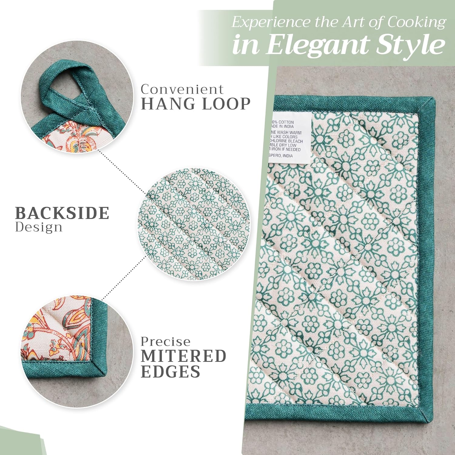 - Package includes: 2 pot holders measures 8"x8". Ideal as a hot pad for dishes, coffee pots, cast iron pans, or cookware. Designed in Europe and Made in India, it blends style, function, and comfort into a daily kitchen essential