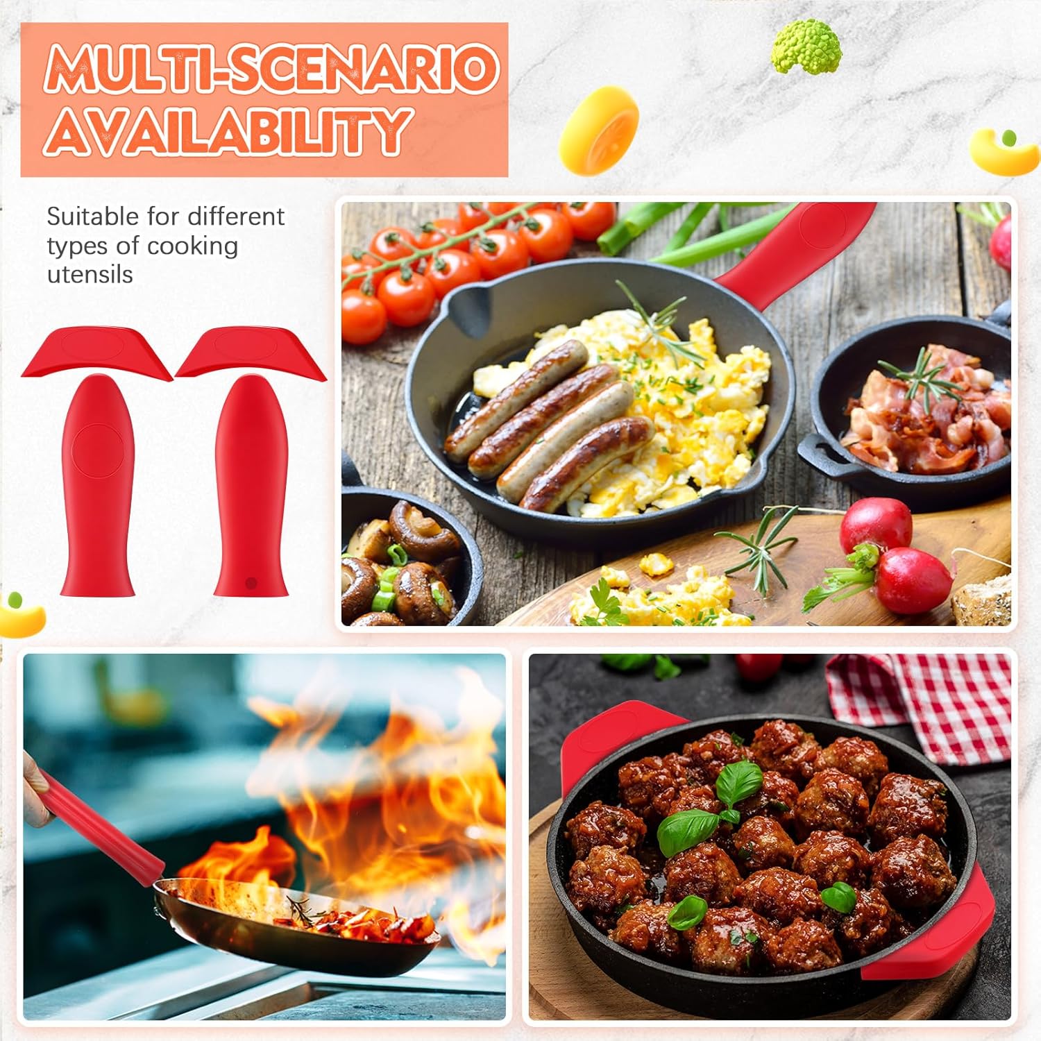 Domensi 4 Pcs Silicone Hot Handle Holder Set Cast Iron Skillet Handle Covers Heat Resistant Silicone Assist Handle Holder for Frying Pans Cast Iron Skillet Griddles Cookware(Red)