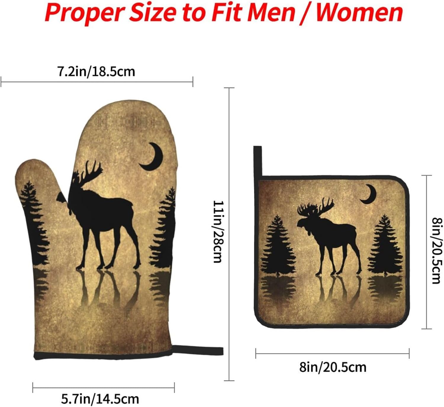 Rustic Elk Moose Deer Forest Pine Tree Moon Design Oven Mitts and Pot Holders Sets of 4 High Heat Resistant Vintage Animal Oven Mitts Oven Gloves and Hot Pads Potholders for BBQ Cooking Mitts