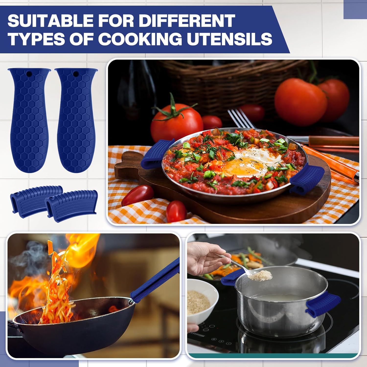 - Package Content: there are 4 pieces of silicone hot handle holders that come in navy blue, 4 pieces of silicone assist handle holders available in navy blue, enough quantity and classic style enough for your daily use, can be changed and shared, and easy to find; Suitable for using at home, travel or camping, nice gift for Mother's day, birthday, holidays, housewarming, chef and hostess
