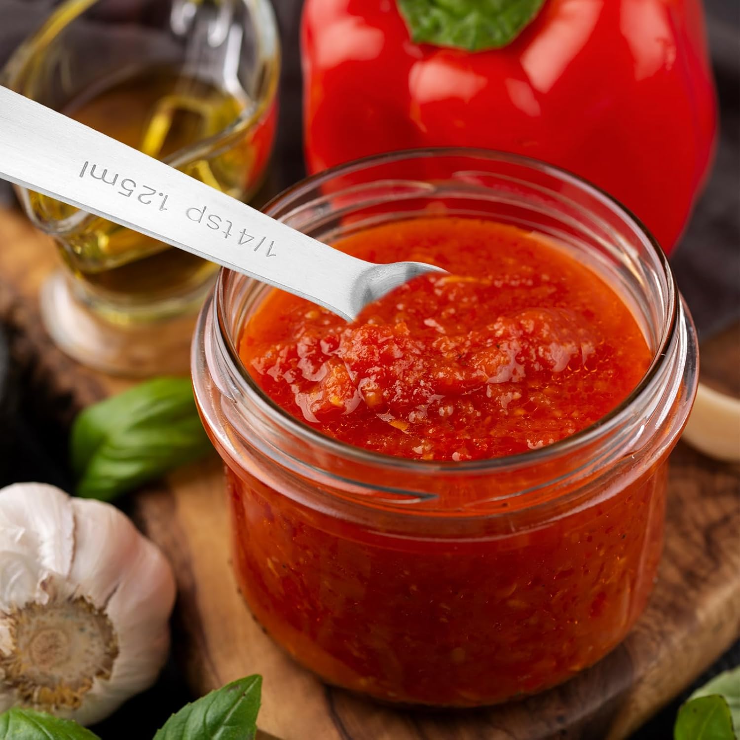- 【Thoughtful Design】Our 1/4 tsp measuring spoon is thoughtfully designed, combining the essence of the cup-shaped round head design and the long handle design. This allows the small measuring spoons to easily penetrate into spice jars and other small containers, effectively overcoming the problem of spice spillage and spoon storage, bringing you an unprecedented convenient experience