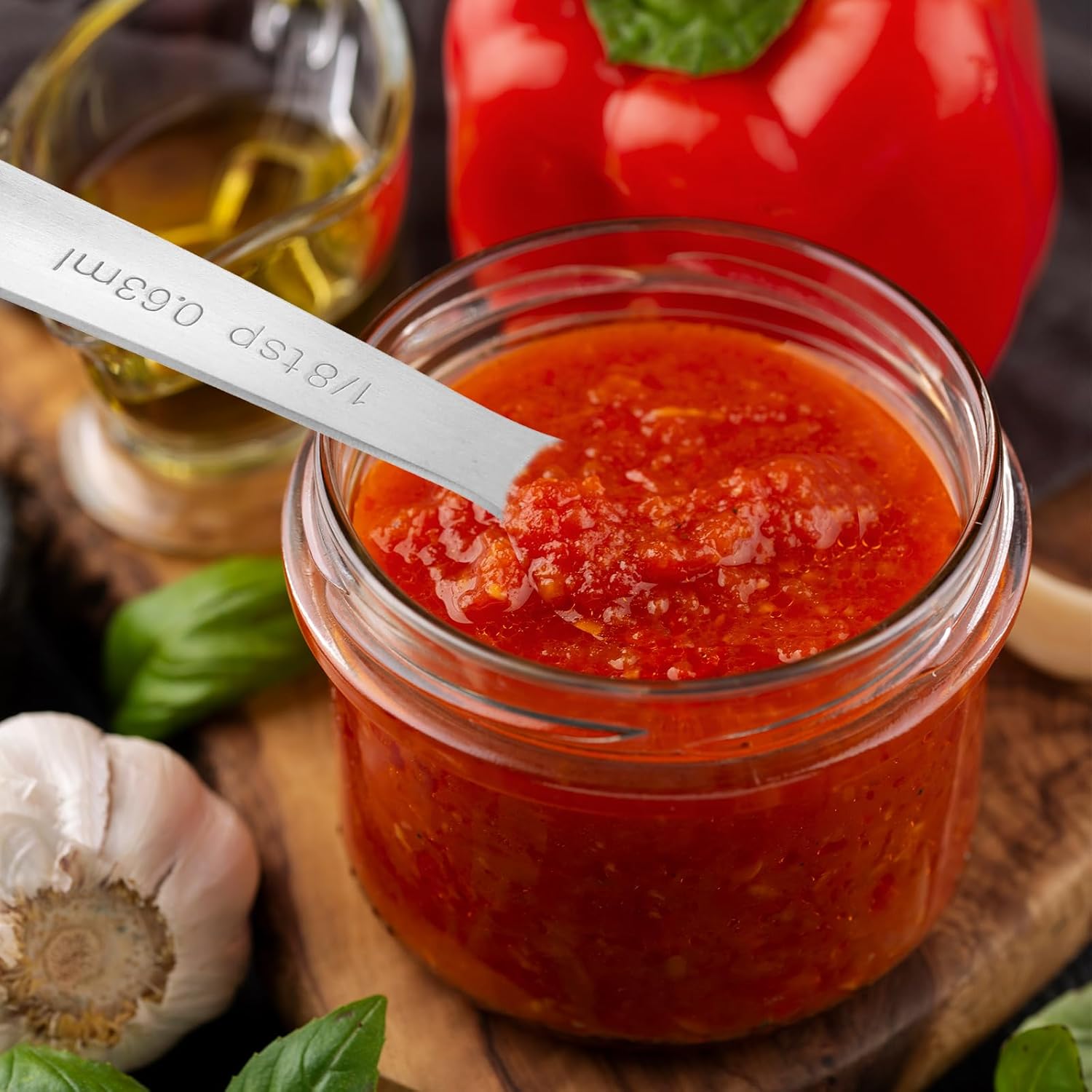 - 【Thoughtful Design】Our 1/8 tsp measuring spoon is thoughtfully designed, combining the essence of the cup-shaped round head design and the long handle design. This allows the small measuring spoons to easily penetrate into spice jars and other small containers, effectively overcoming the problem of spice spillage and spoon storage, bringing you an unprecedented convenient experience