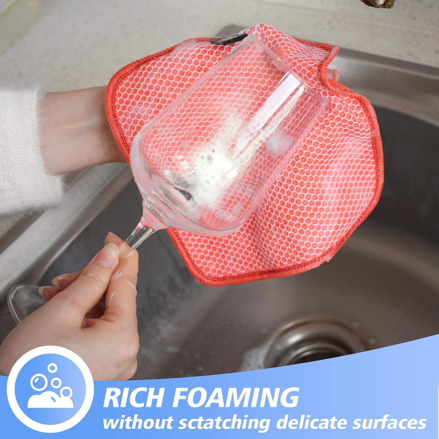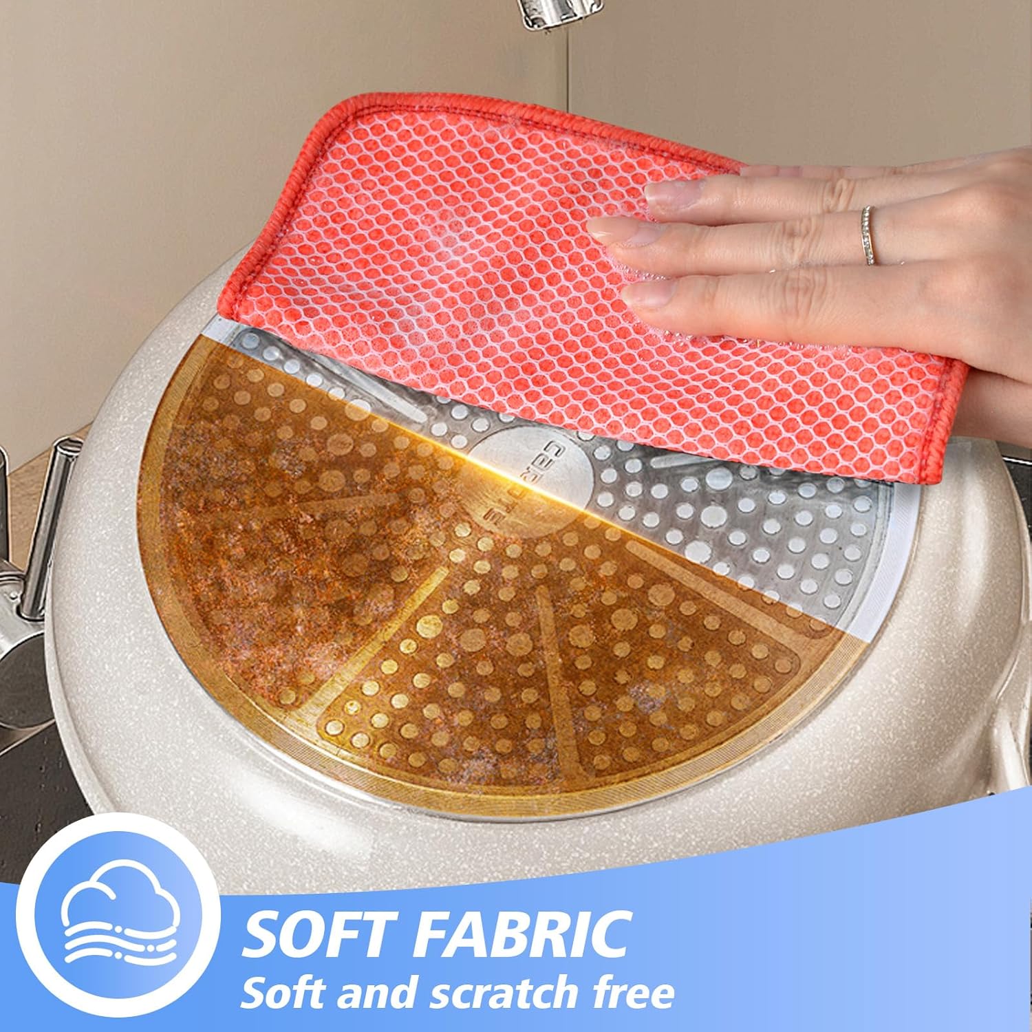 - DISH RAGS FOR KITCHEN CLEANING WITH POLY SCOUR SCRUBBING SIDE: One side is microfiber and the other side is mesh. The microfiber side works well at getting finger spots off the stainless steel appliances and the glass front of fridge or stove, microwave; the scrubby side is good for cleaning stuck on food without having to grab your scraper and does not scratch delicate surfaces either