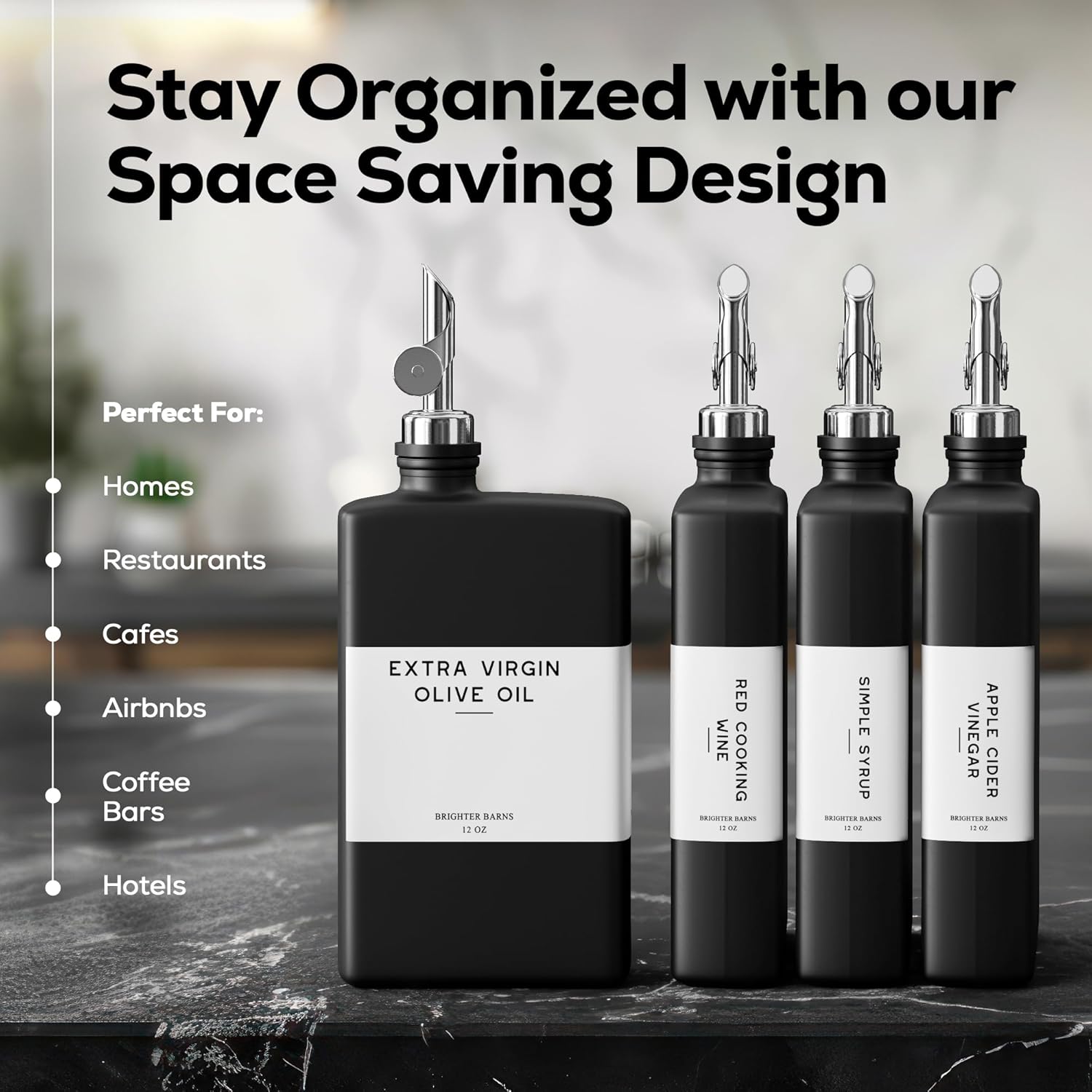 - ELEVATE YOUR SPACE & STAY ORGANIZED - Transform your kitchen with our elegant, space-saving glass oil bottles for kitchen. The sleek, minimalist design not only adds a touch of luxury but also keeps your kitchen organized with its slim, elegant profile. Tailored to blend seamlessly with any decor—from modern and luxury to farmhouse, minimalist, neutral or vintage, this is the kitchen decor upgrade your home, coffee bar, Airbnb, café, or restaurant has been waiting for.