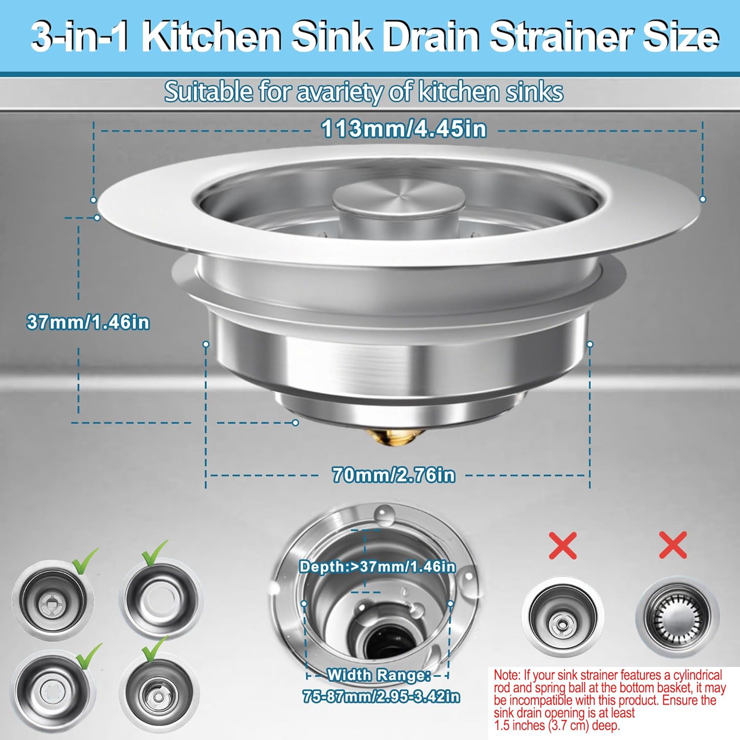 - UNIVERSAL FIT FOR U.S. STANDARD SINKS: This kitchen sink stopper fits all standard 3.5-inch sink drain holes. The product dimensions of the Kitchen Sink Drain Strainer are 4.45 inches in width and 1.46 inches in height.Easy to install and remove, perfect for kitchen, RV, restaurant, or utility sinks.