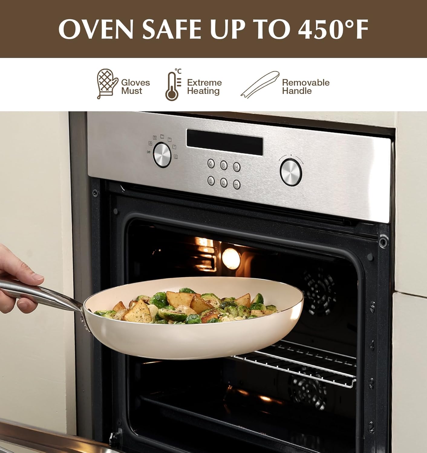 - Fast & Even Heating – Made with an aluminum alloy body and stainless steel base, featuring a thick magnetic bottom that ensures stable heat distribution and fast, even heating. Compatible with gas, ceramic, electric, halogen, and induction cooktops. Oven safe up to 450℉.