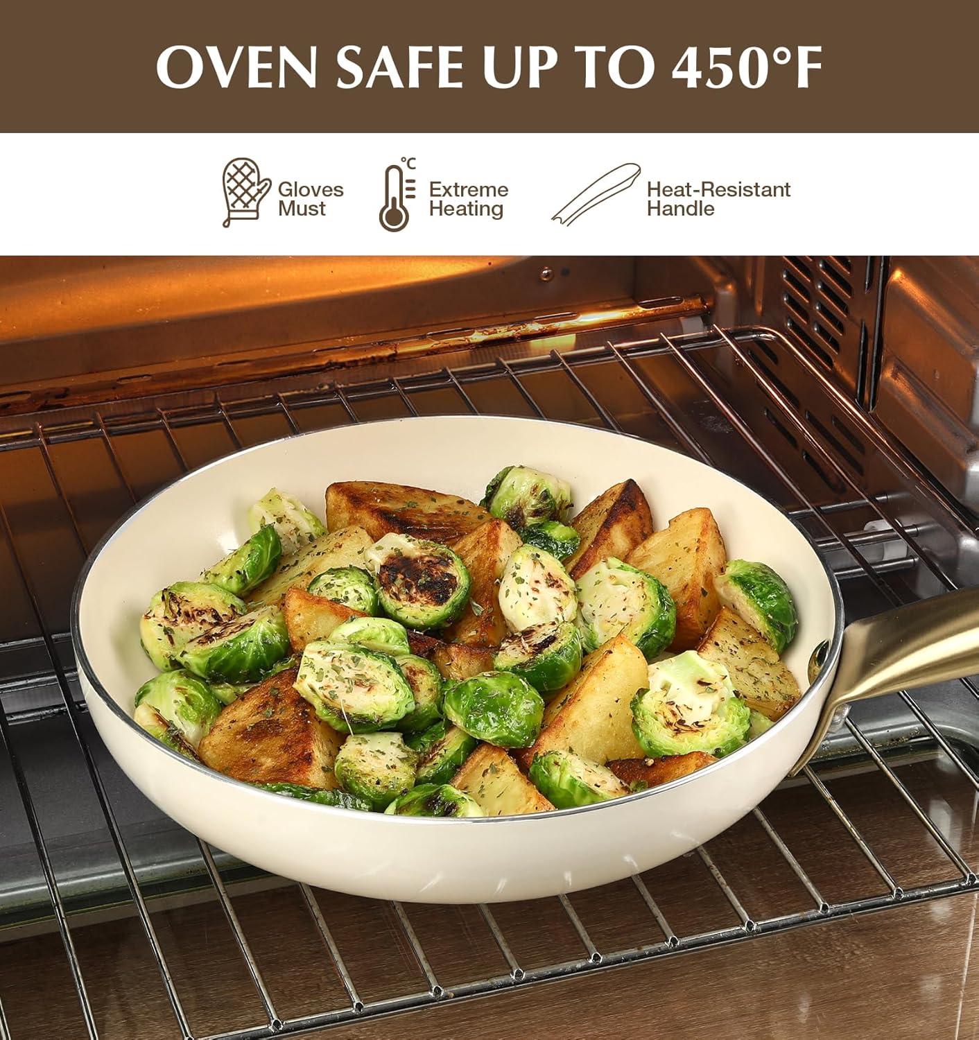 - Fast & Even Heating – Made with an aluminum alloy body and stainless steel base, featuring a thick magnetic bottom that ensures stable heat distribution and fast, even heating. Compatible with gas, ceramic, electric, halogen, and induction cooktops. Oven safe up to 450℉.