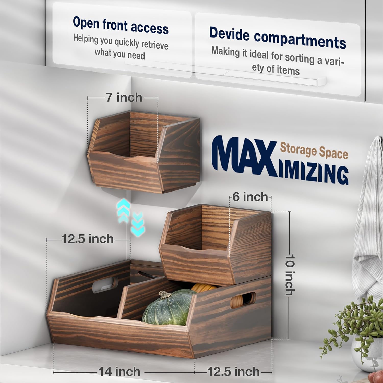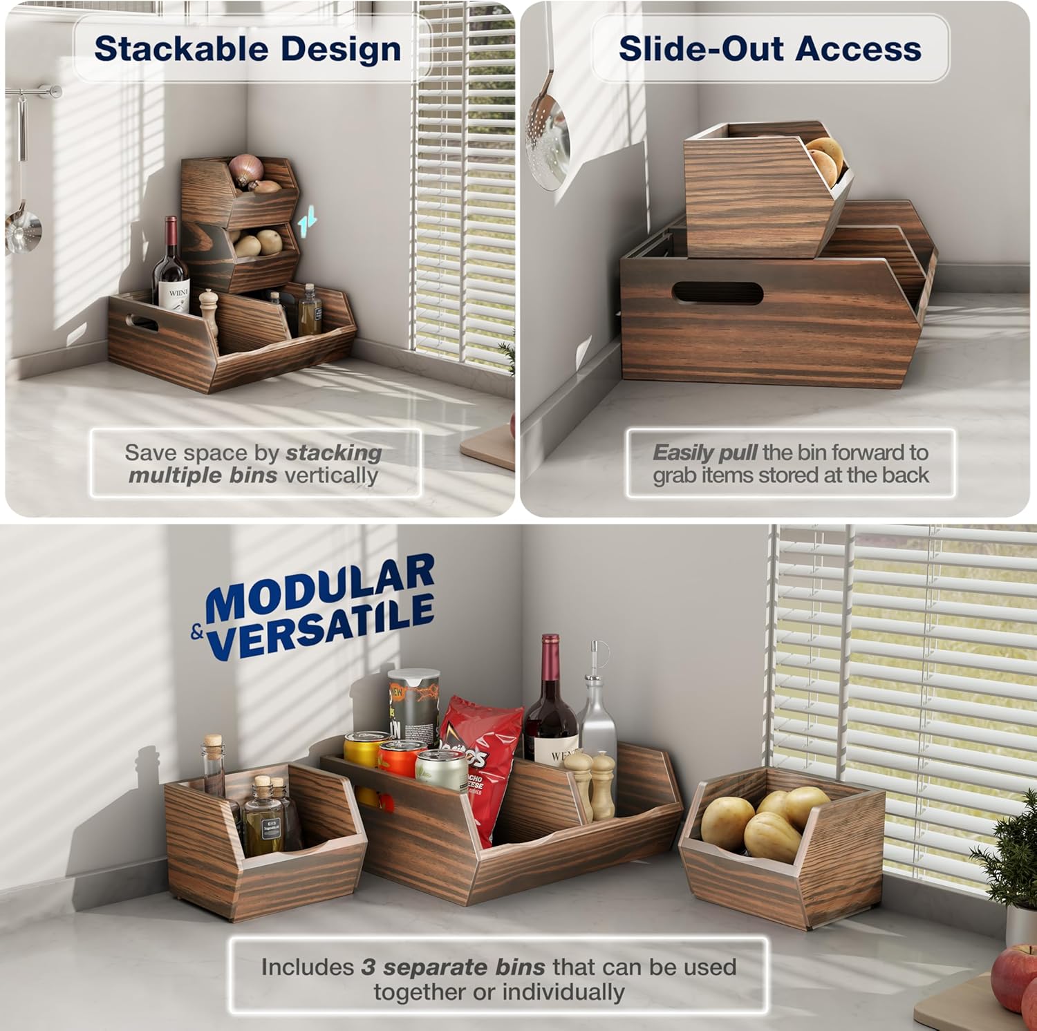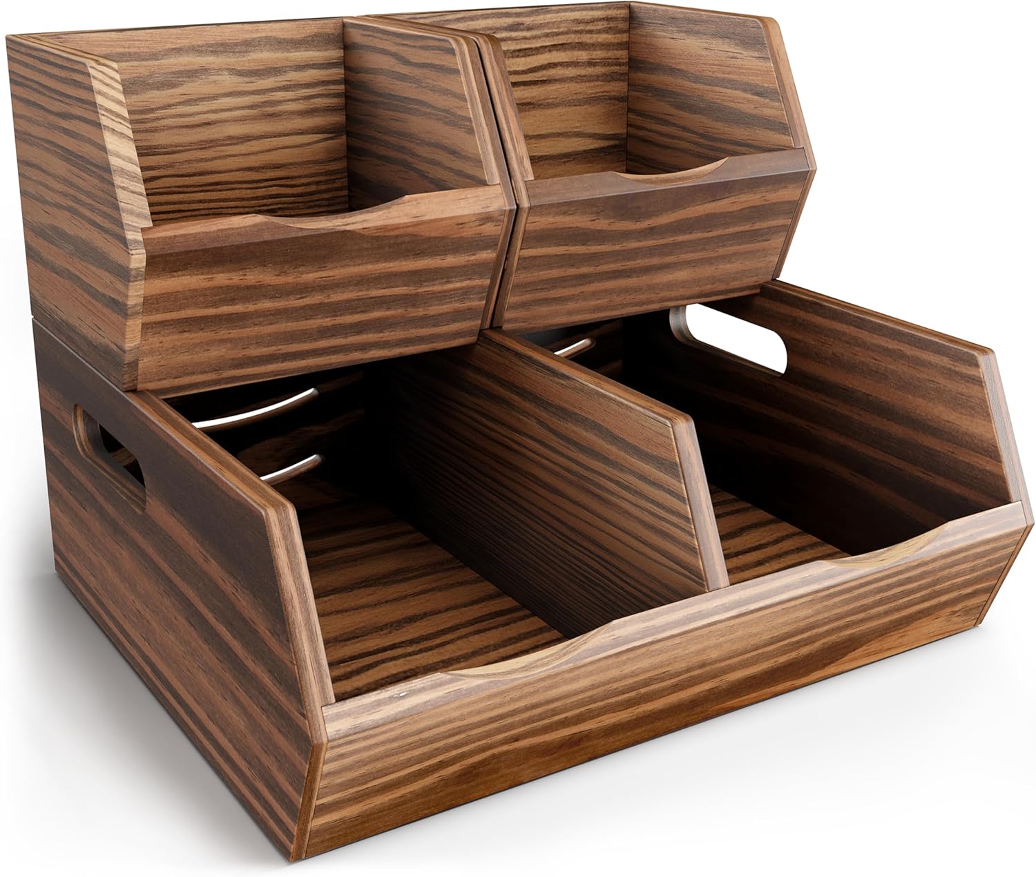Acacia Wood Pantry Storage Bins β Stackable Open Front Kitchen Baskets for Potato, Onion, Fruit, Bread & More β Rustic Wooden Basket for Pantry (Walnut - Pine Wood)