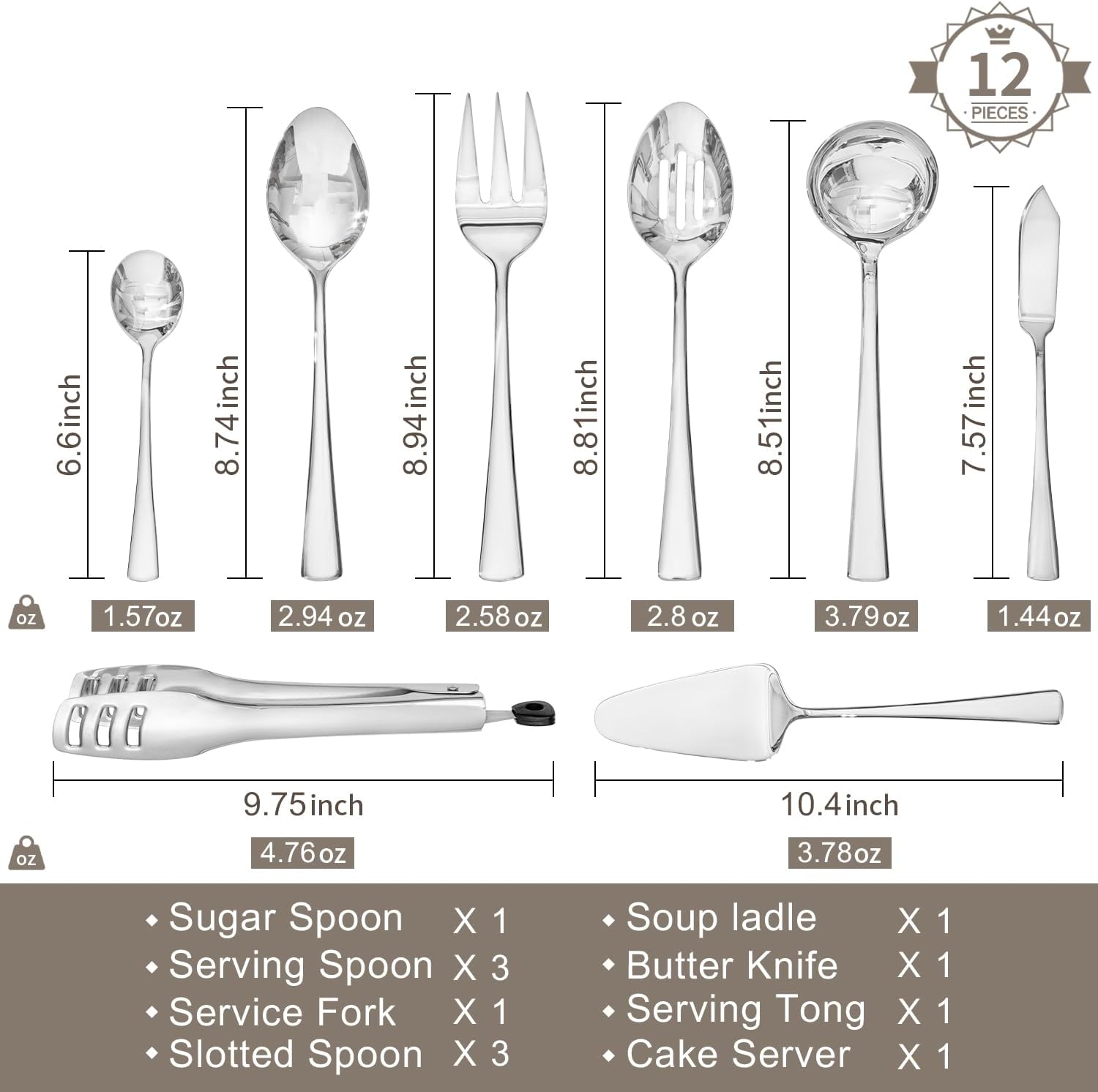 - Components: 12 Piece serving utensils includes 3 serving spoon(8.74inch),3 slotted spoon(8.8inch),1 serving fork(8.94inch),1 serving tong(9.75inch),1 soup ladle(8.5inch),1 cake server(10.4inch),1 butter knife(7.57 inches), 1 sugar spoon(6.6 inches)