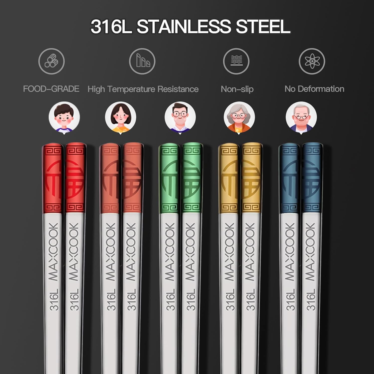 - 【316L Stainless Steel Chopsticks】This 5-piece set of non-slip chopsticks is made of 316L stainless steel, these metal chopsticks offer superior corrosion resistance and longer life than standard 304 stainless steel. The high quality material ensures that there is no metallic residual odor, making it safer for you to enjoy sushi, noodles, and delicious food with these reusable chopsticks