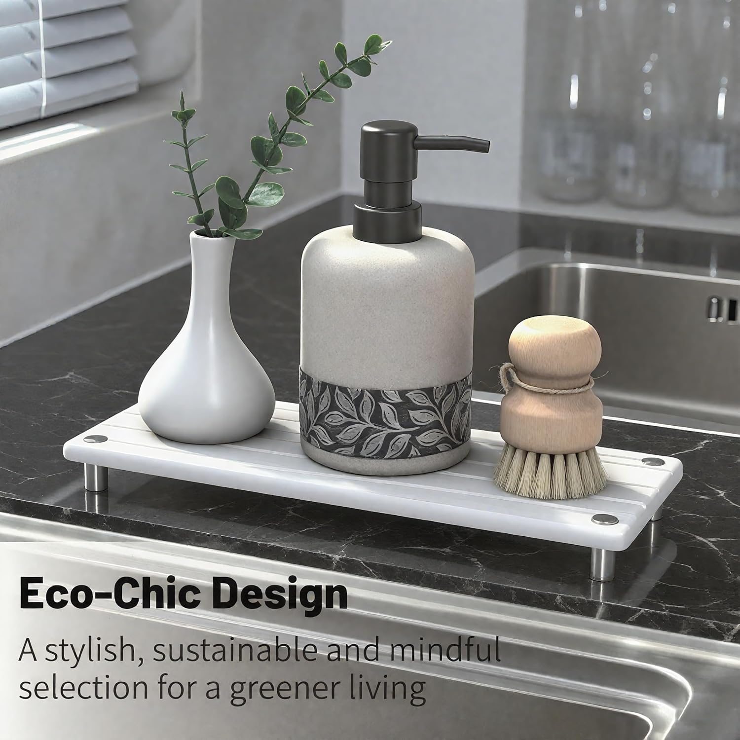 - Quick Water Absorption and Fast Drying --- Our fast drying kitchen sink organizer is made from natural diatom mud, the small pores in diatomaceous earth give it amazing water absorption. It swiftly absorbs water and dries in minutes, keeping your countertop consistently dry and tidy, free from pesky water droplets.