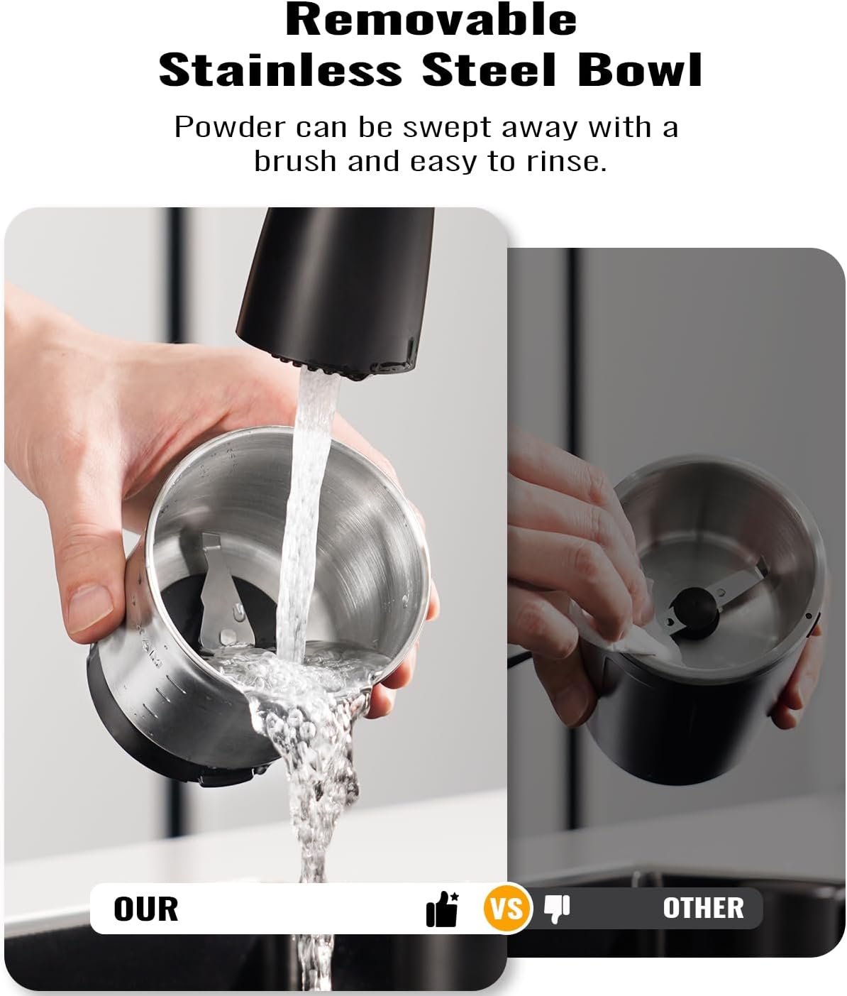 - Removable Grinding Cup: The electric grinder features a removable stainless steel grinding cup for easy cleaning. It can be rinsed with water or placed in the dishwasher. A cleaning brush is also included to help sweep away residual powder. The cup holds up to 2.5 ounces of coffee beans—enough to brew 10 cups of coffee.