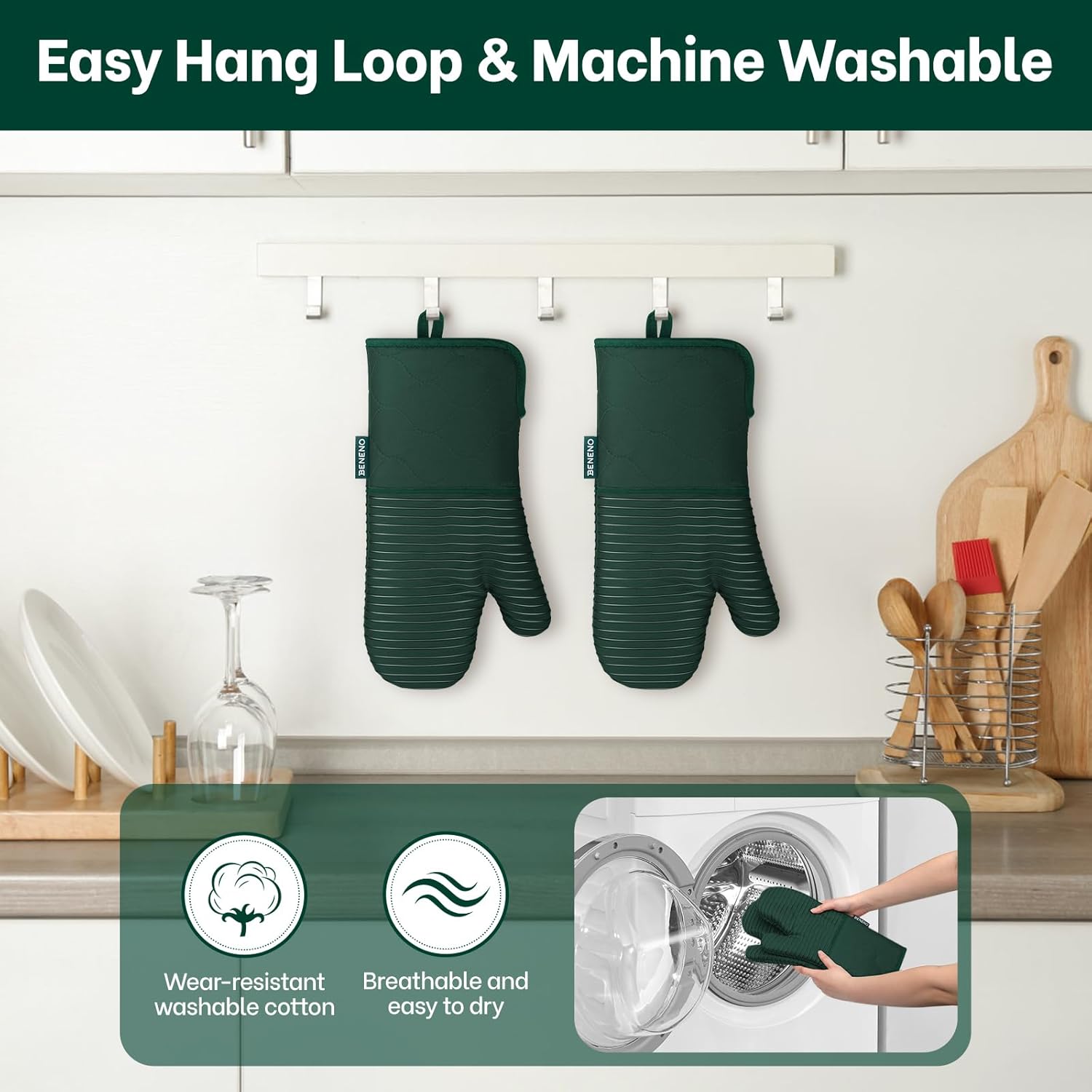 - Easy to Care & Easy to Store: Designed for busy kitchens, these oven mitts are completely machine washable to maintain freshness after long term cooking use, the built-in hanging loop provides instant organization, keep them within reach while adding a stylish touch to your kitchen decor