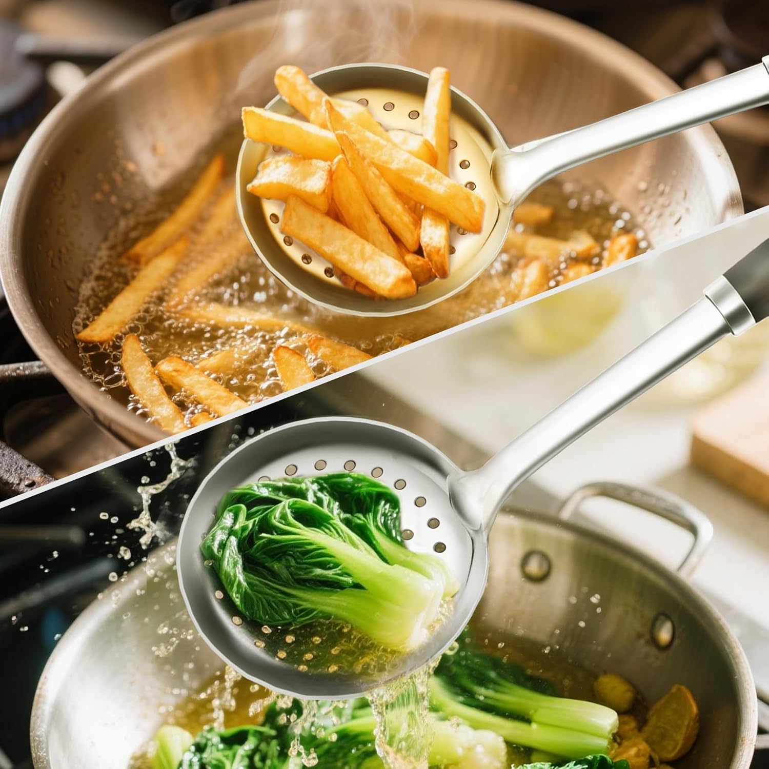 - HEAVY DUTY COOKING UTENSIL SET - This stainless steel cooking spoon set includes a pasta server and a slotted spoon/skimmer. They have thick and long handle and good heat insulation. That makes us feel comfortable to use them, and they won't bend easily.