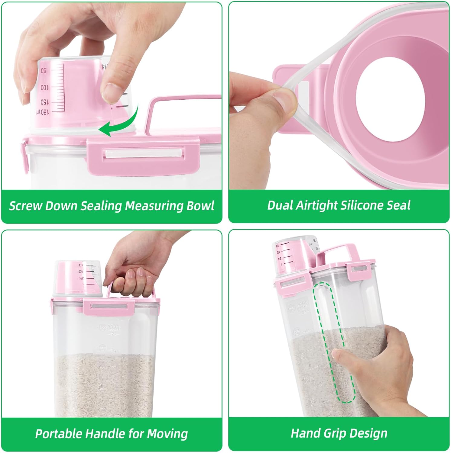 - Easy Pouring: The rice storage container features a pouring spout makes it a breeze to dispense your ingredients. Its ergonomic design offers a comfortable grip for easy, single-handed pouring