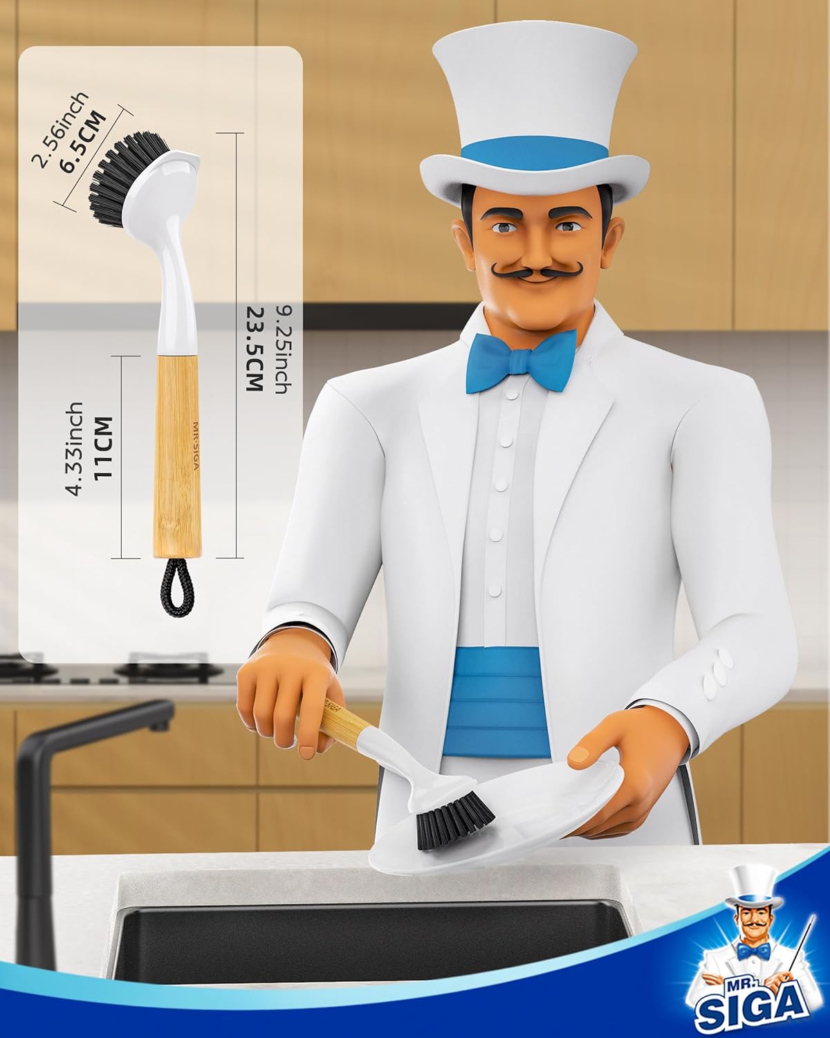 MR.SIGA Dish Brush with Handle, Dish Scrub Brush with Built-in Scraper, Bamboo Dish Brush for Pots and Pans, Kitchen Sink, 2 Pack