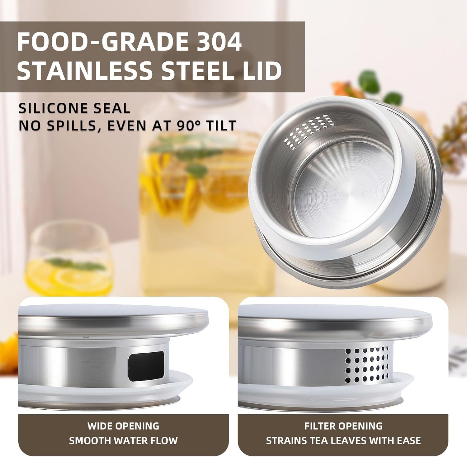 - Functional rust-proof stainless-steel lid: 304 stainless steel lid features 2-way outlets with large holes and small holes for filtration. Itβs quite multi-functional for family use. The food-grade rubber ring makes sure the lid is tight and does not fall off while pouring.