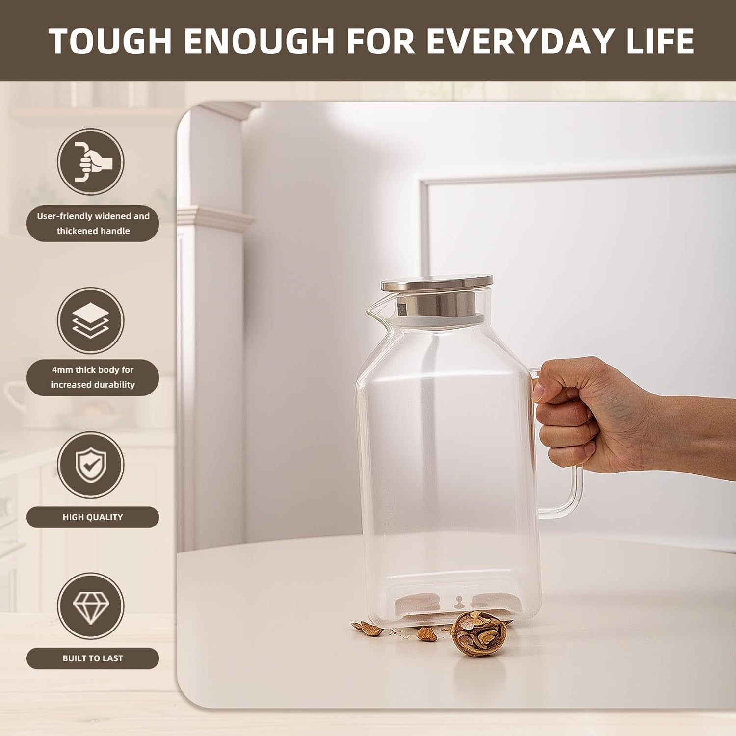 - Borosilicate glass: It is made of food-grade borosilicate glass, which is lead-free and durable. Ergonomically designed handle makes it easy to hold and pour.