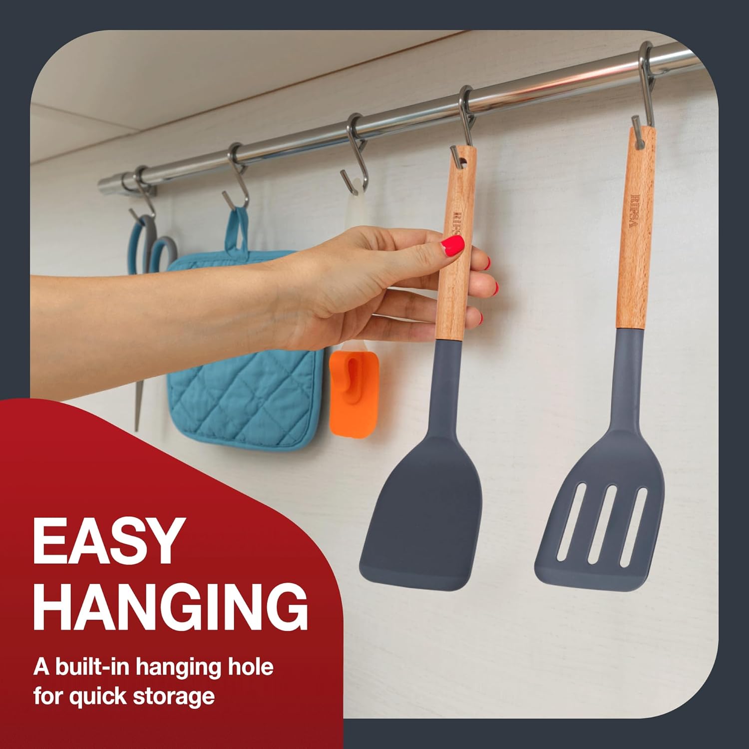 - EASY TO CLEAN AND MAINTAIN: To keep the wooden handles lasting longer, it’s best to wash them by hand with a soft cloth after use. This helps remove any leftover food or grease easily. Plus, the handy round hanging hole makes drying and storing the silicone spatula set quick and convenient.