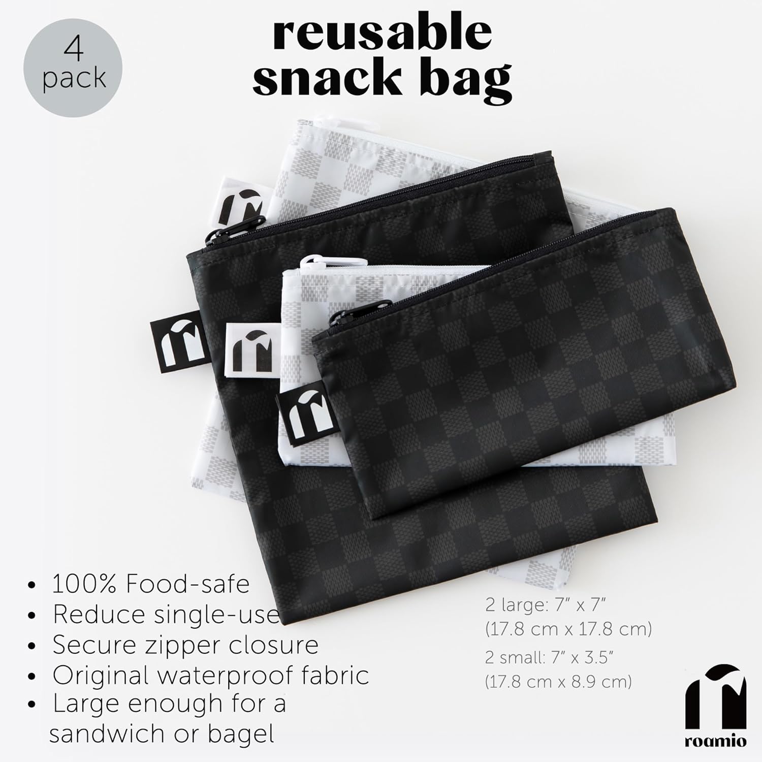 Roamio Reusable Sandwich and Snack Bags, for Kids School Lunch and for Adults Portion, Washable Fabric, Waterproof Cloth Zip Bag, Travel Pouch, Food-Safe Storage,4-pack Set Black Check and Off White