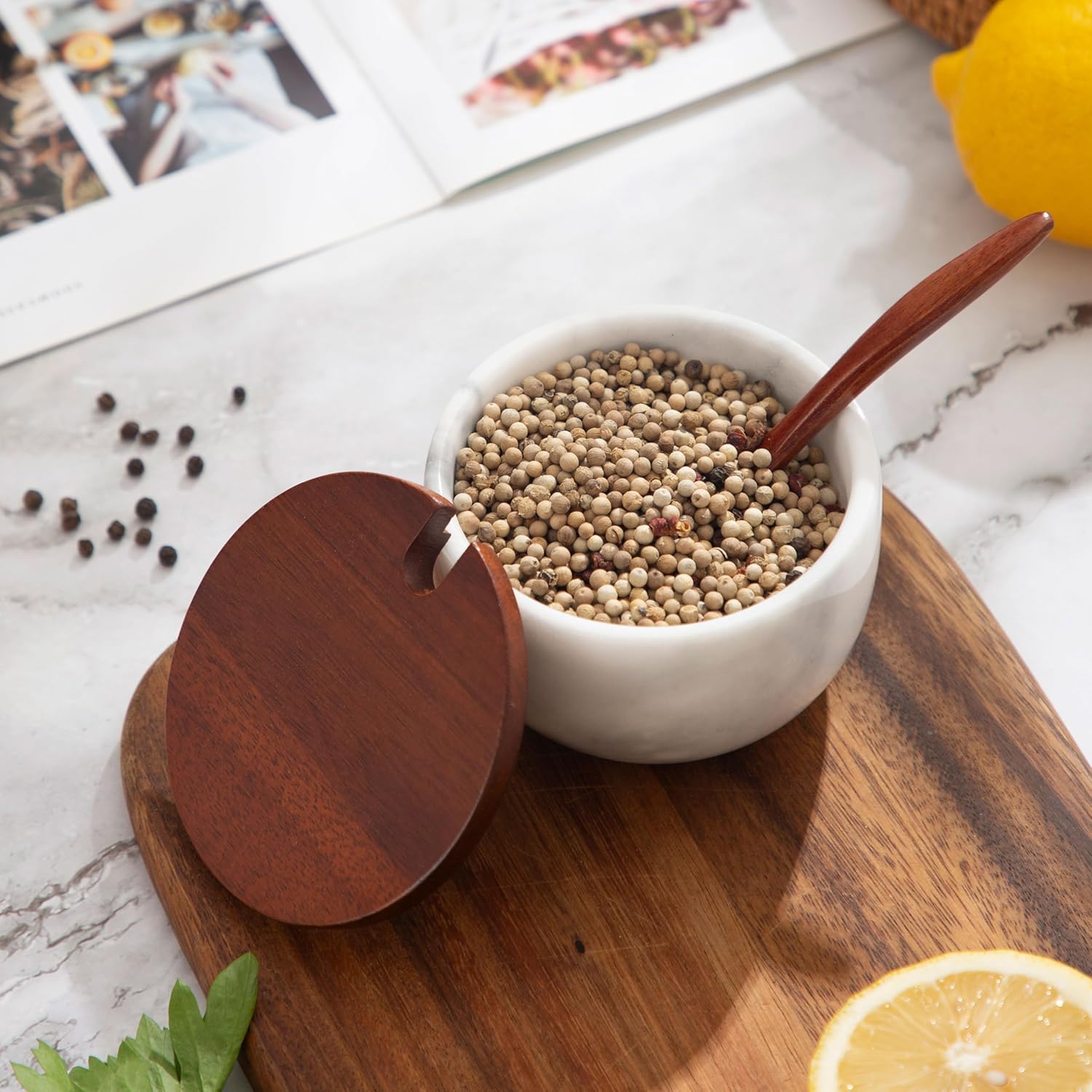 Marble Salt Cellar with Lid & Spoon, 11oz Salt and Pepper bowls, Handcrafted from Natural Marble, Smooth Inside (white bowl)