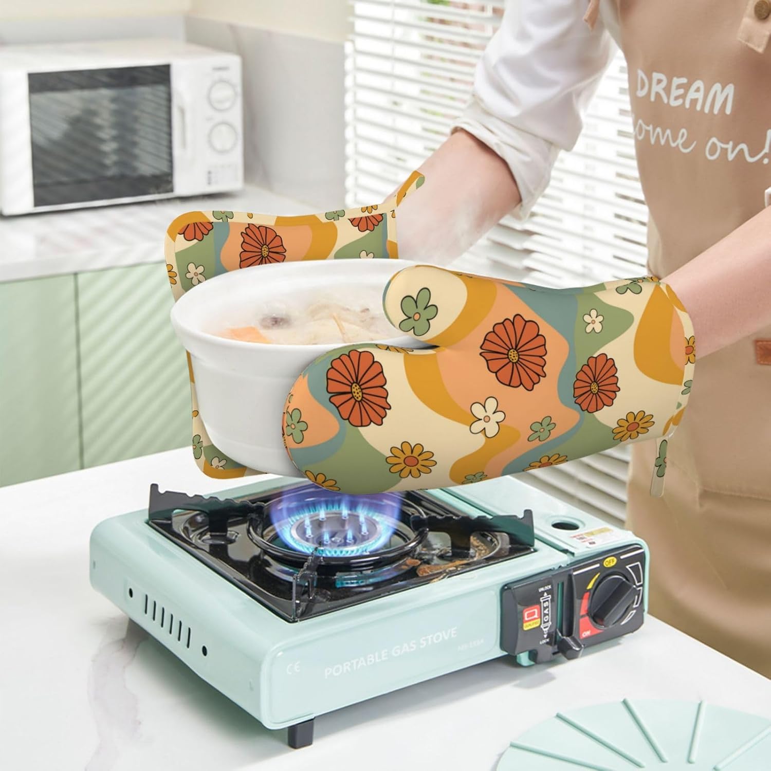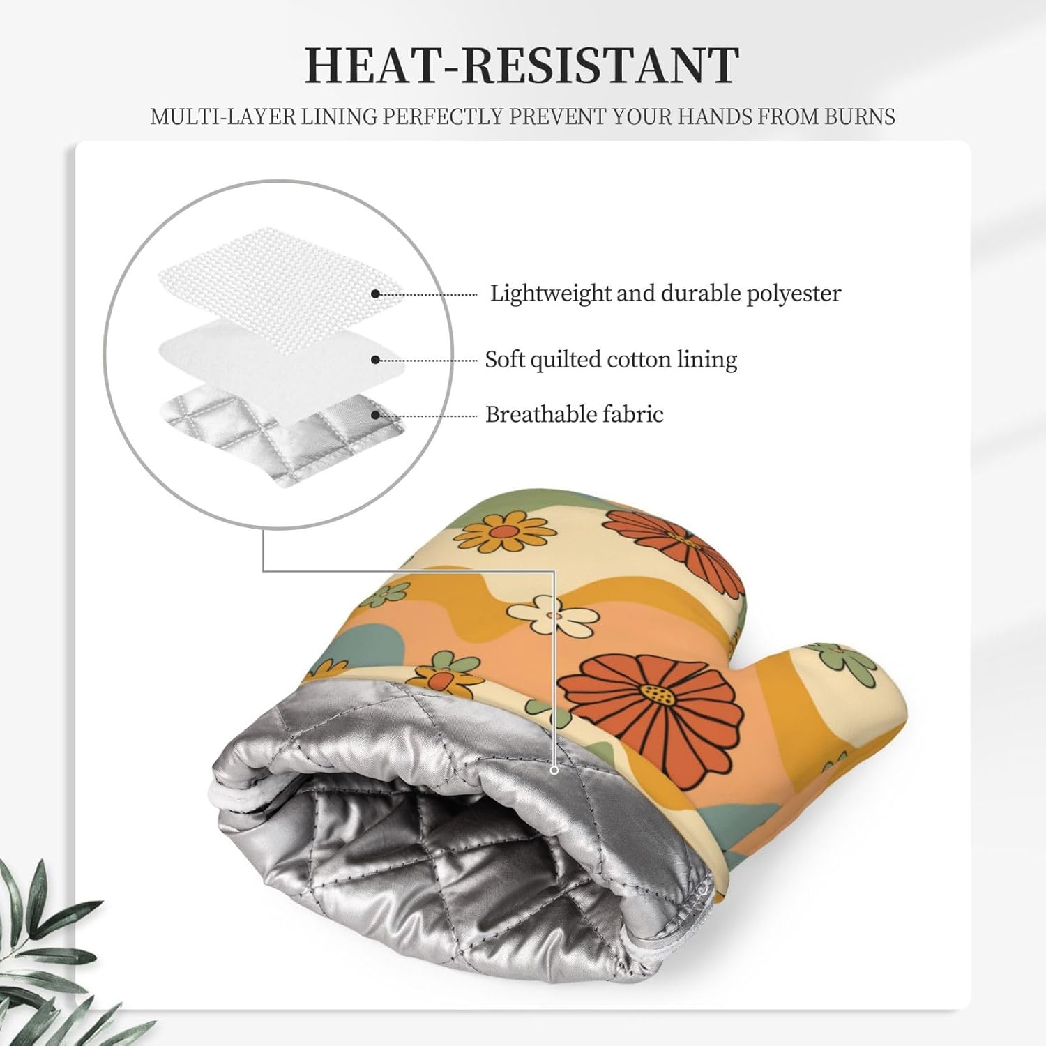 - HEAT RESISTANT: The 70s groovy cute vintage flower floral silicone oven mitts and non-slip pot holders set are heat resistant at 392 F/200 C because of their durable construction so they can effectively keep you protected from burning while you enjoy cooking and grilling