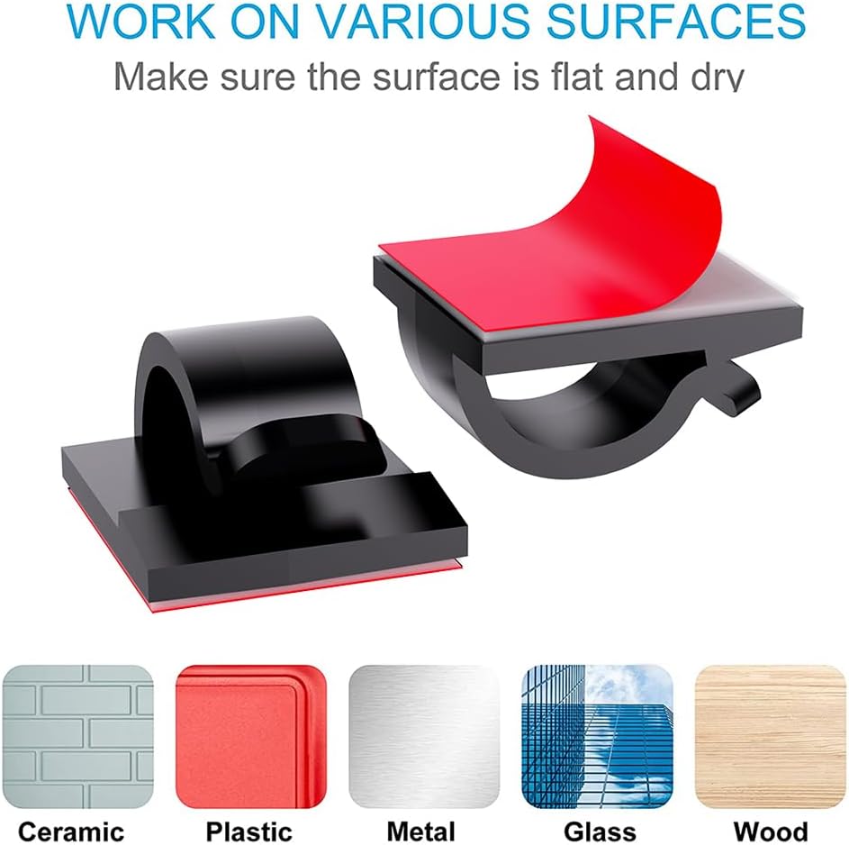 - Strong Adhesive: Made of PA66 material and upgraded adhesive, these cable clips can firmly hold cables, wires, and cords in place, remove without any residues and damage. Works on all clean surfaces like desks, walls, cabinets, wood, ceramics, metal, et