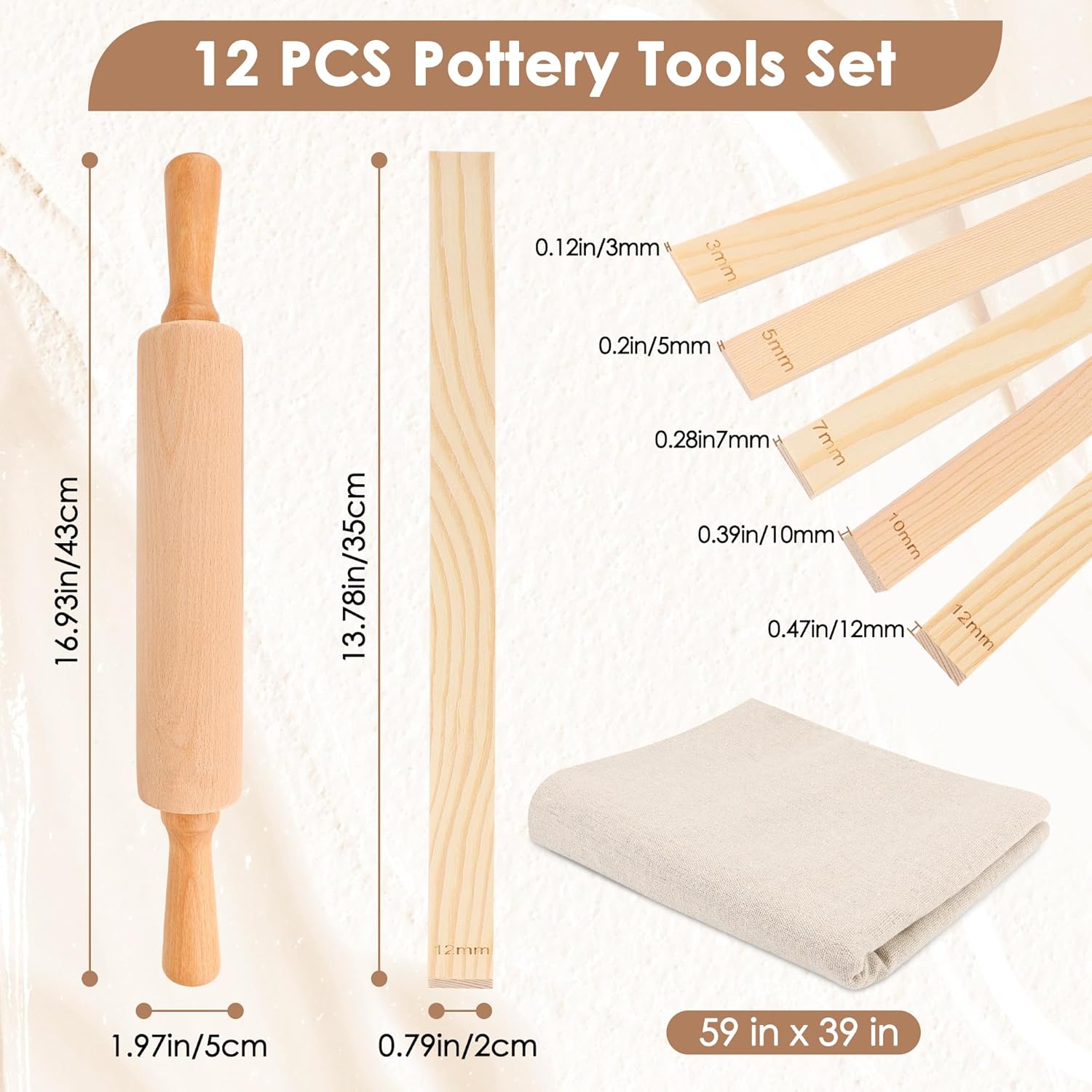 - Package Includes: You will receive 12 pcs pottery tools, including 1 wooden rolling pin, 1 cotton and linen tablecloth for pottery and 10 clay rolling rod guides of 5 different thicknesses, 2 pieces of each size, rich variety to meet your various pottery needs.