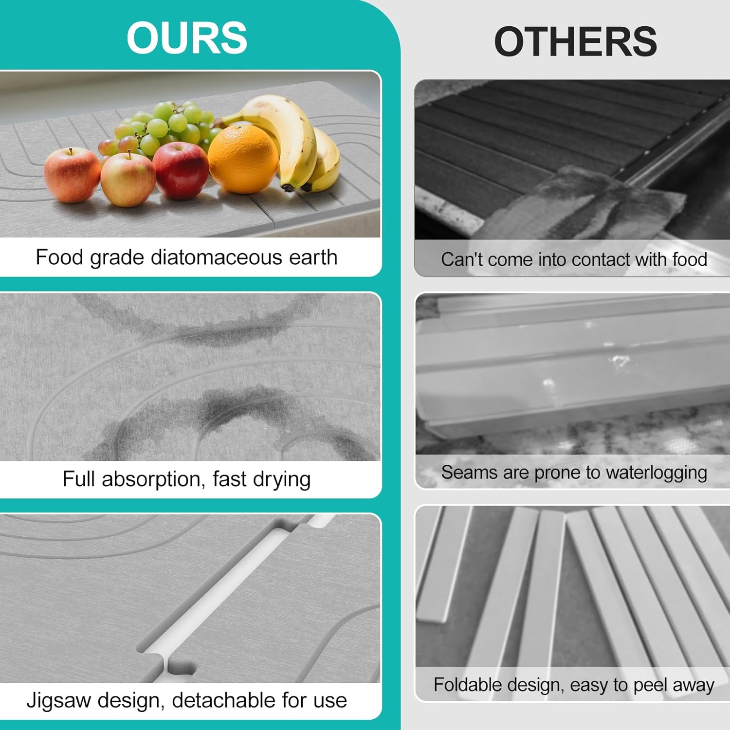 - Water Absorption and Fast Drying: Our quick dry stone mat kitchen is made of porous natural diatomaceous earth, which has good water absorption. After absorbing water, it can be dried in about 30 seconds by placing it in a ventilated area. The dish mat drying kitchen mat remains stable even when placed on a wet tabletop and preventing slipping while drying dishes or fruits.