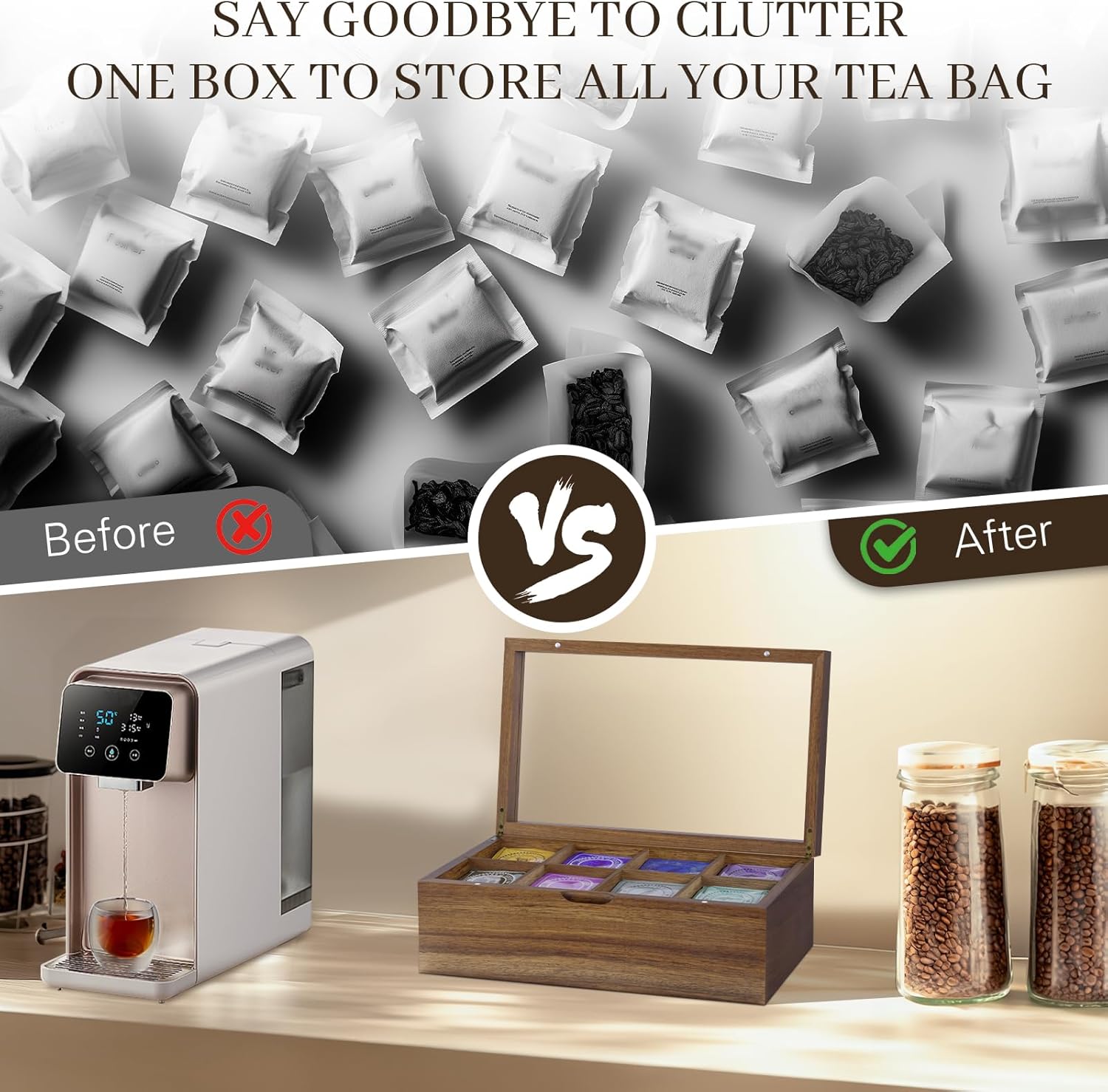 Acacia Wood Tea Bag Organizer, 8 Compartments Tea Box Organizer Storage Box, Teabag Holder Organizers with Clear Acrylic Window, Magnetic Lid and Removable Dividers