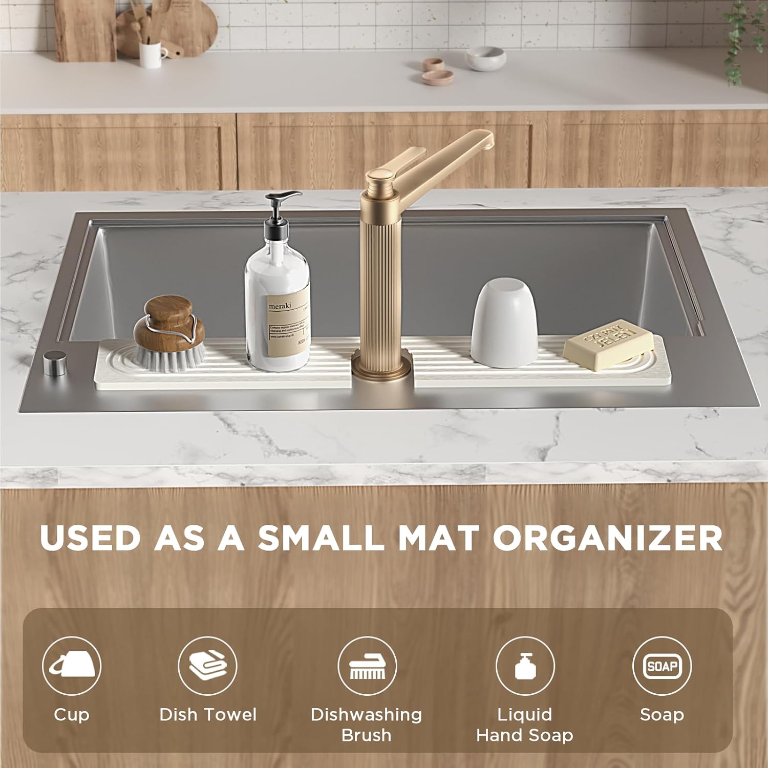 - ๐๐ข๐ง๐ค ๐๐๐ญ & ๐๐ซ๐ ๐๐ง๐ข๐ณ๐๐ซ: This mat serves a dual purpose in your sink area. In addition to effectively absorbing water around the faucet, it functions as a practical holder for soap, toothbrushes, cups, dish sponges, and other items that require drying, keeping your countertops clean and dry