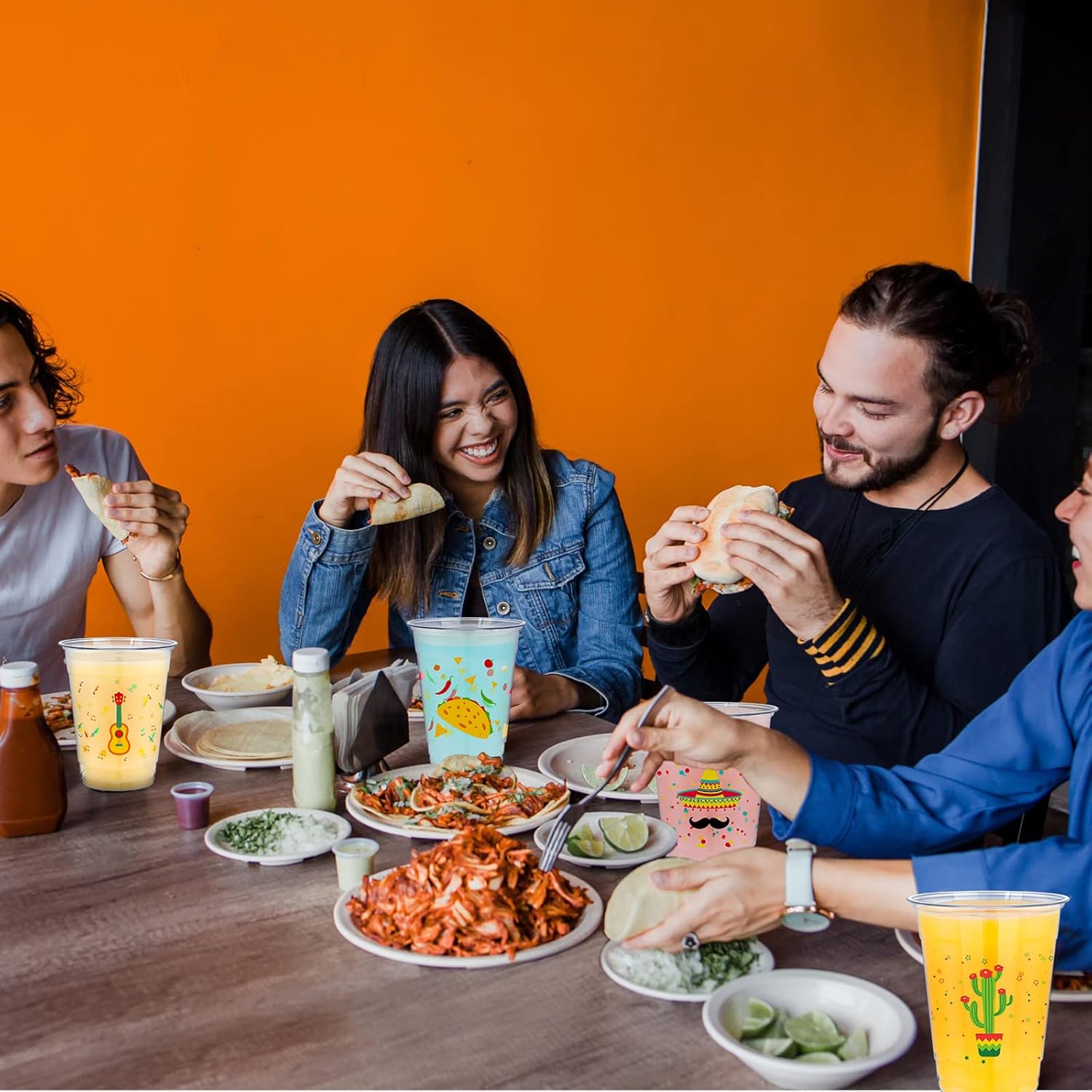 meekoo 200 Pack 12 oz Fiesta Cups Plastic Mexican Cups Clear Disposable Mug Cinco De Mayo Party Decorations for Fiesta Taco Birthday Party Drinkware Supplies, 4 Styles