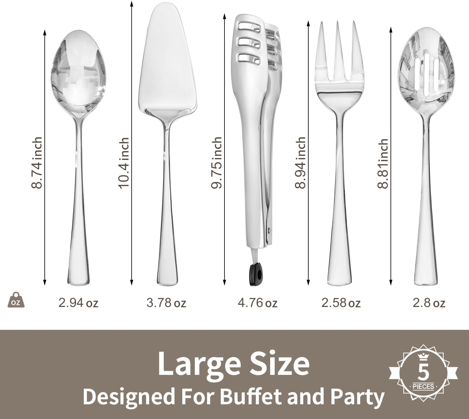 - Complete Serving Utensils Set of Components: 5 Piece serving utensils include serving spoon(8.74inch), slotted spoon(8.8inch), serving fork(8.94inch), serving tong(9.75inch), cake server(10.4inch)