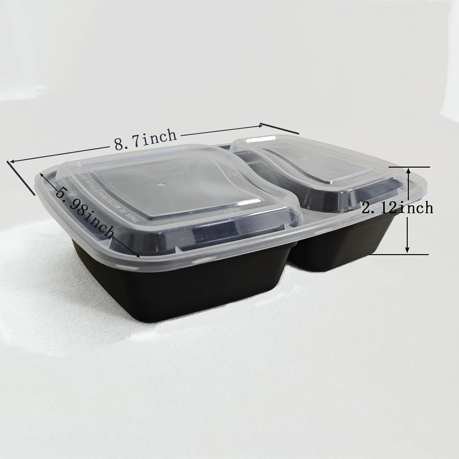 - The Container Capacity For Plastic Meal Prep Box is 28 Ounces. The External Dimensions Are Approximately 8.6 Inches Long, 5.8 Inches Wide, And 2.1 Inches High. These Meal Boxes Disposable Come in Two Types: Circular And Square. Based On Your Food And Space Requirements, You Can Find The Size of The Food Container You Need. The Black Background And White Lid Have High Transparency, Allowing You To Directly See The Food Inside The Container.