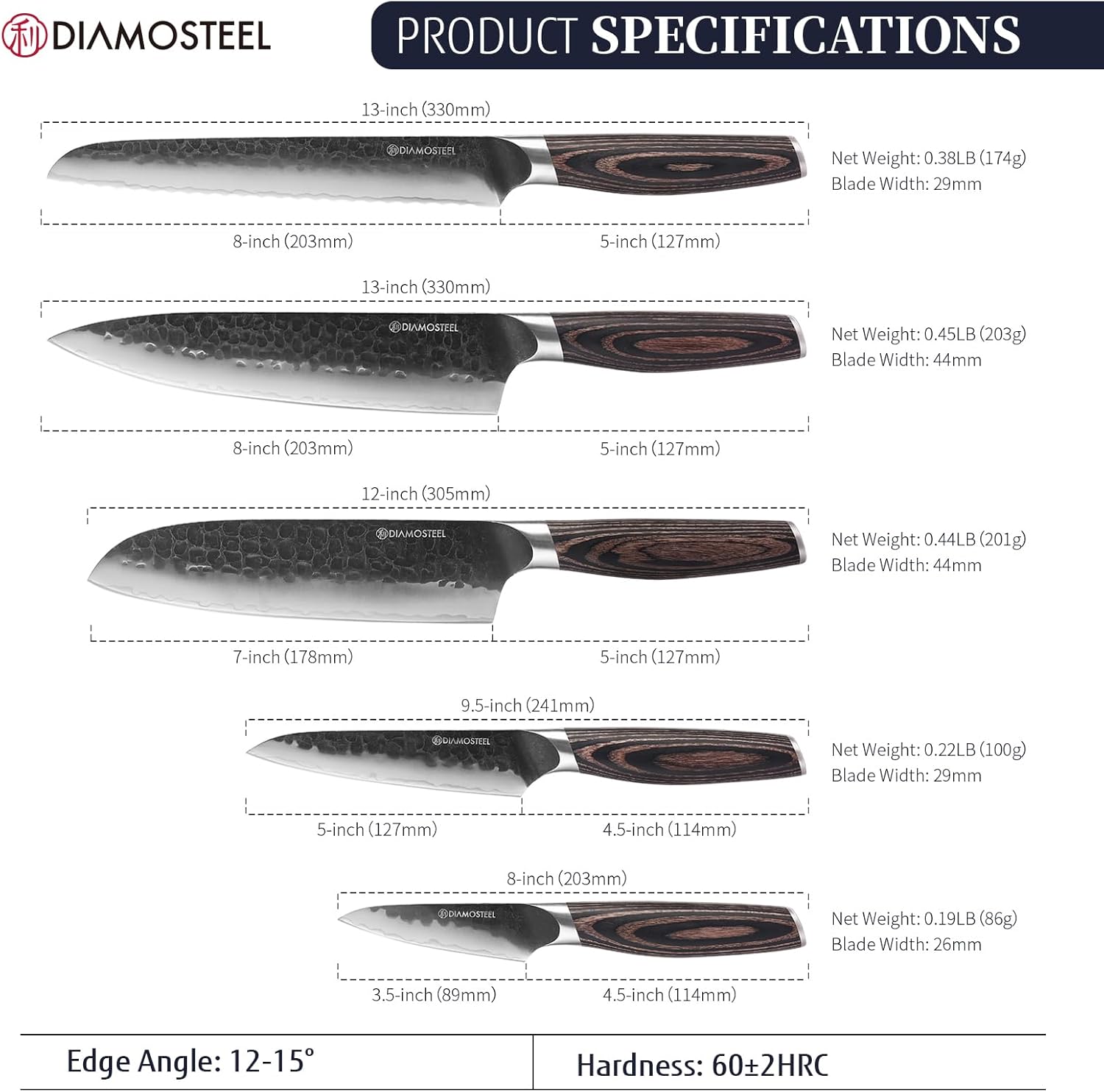 - Diamosteel japanese knife set is crafted from 9CR18MOV high-carbon stainless steel for exceptional rust resistance and edge retention. Professionally honed to a 12-15Β° angle and hardened to HRC58-62, our cooking knife set offers razor-sharp, durable blades that stay sharper, longer. Enjoy effortless, precise cutting performance for all your cooking needs.