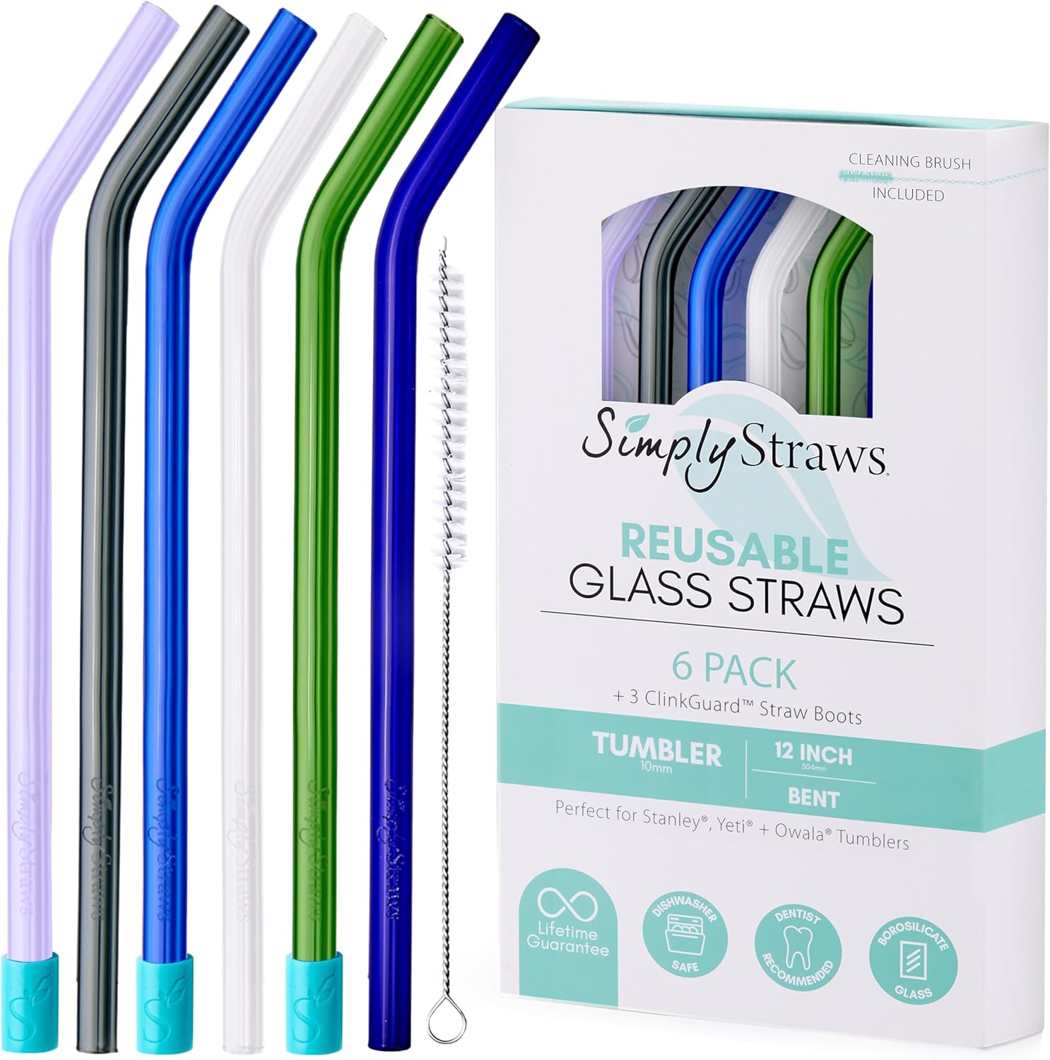 Simply Straws 12 Inch Glass Straws Bent (6-Pack) – Reusable Glass Straws for Stanley 40 Oz Tumbler, with Cleaning Brush – Durable, Dishwasher Safe, Hot & Cold Use, BPA-Free (Seaglass)