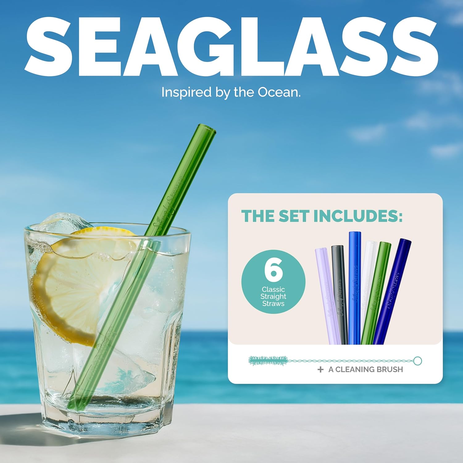 Simply Straws 6 Inch Glass Straws Straight (6-Pack) – Reusable Glass Straws for Low Balls & Stemless Glasses, with Cleaning Brush – Dishwasher Safe, Hot & Cold Use, BPA-Free (Seaglass)