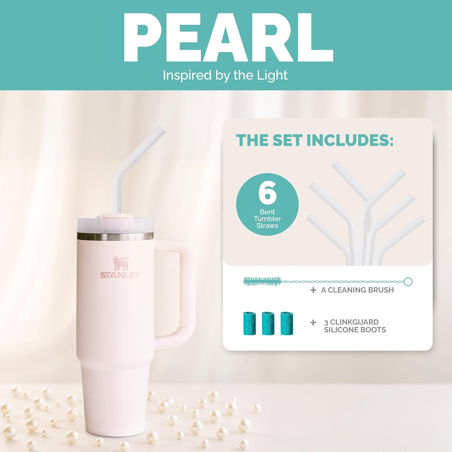 Simply Straws 12 Inch Glass Straws Bent (6-Pack) – Reusable Glass Straws for Stanley 40 Oz Tumbler, with Cleaning Brush – Durable, Dishwasher Safe, Hot & Cold Use, BPA-Free (Pearl)