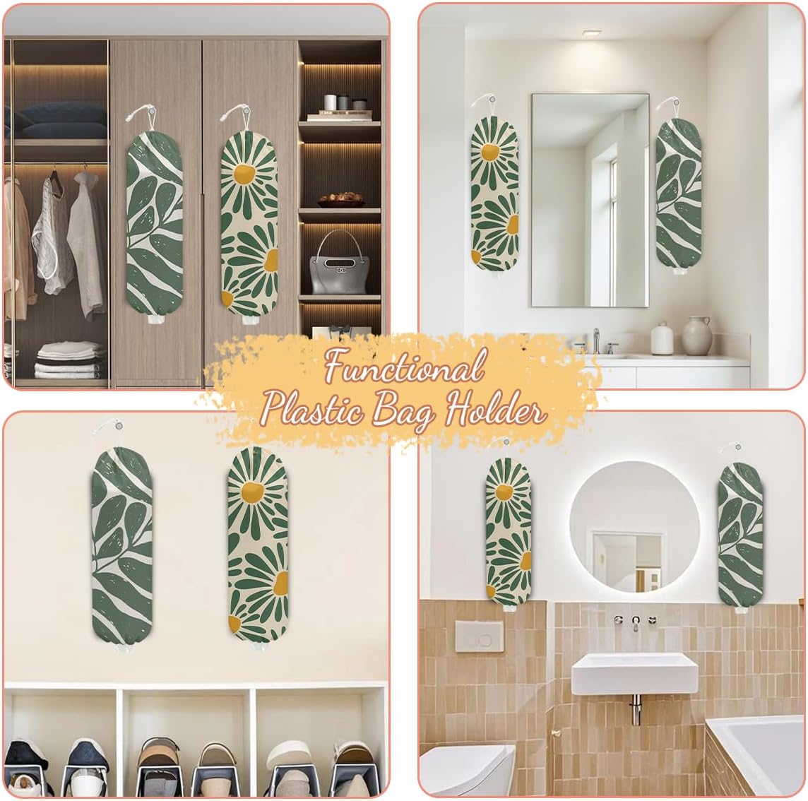 2 Pcs Botanical Plastic Bag Holder, Wall Mount Grocery Bag Holder for Plastic Storage bag, Washable Floral Grocery Bags Organizer Storage Dispenser, Pull Rope Free Adjustment, Flower Gifts for Women