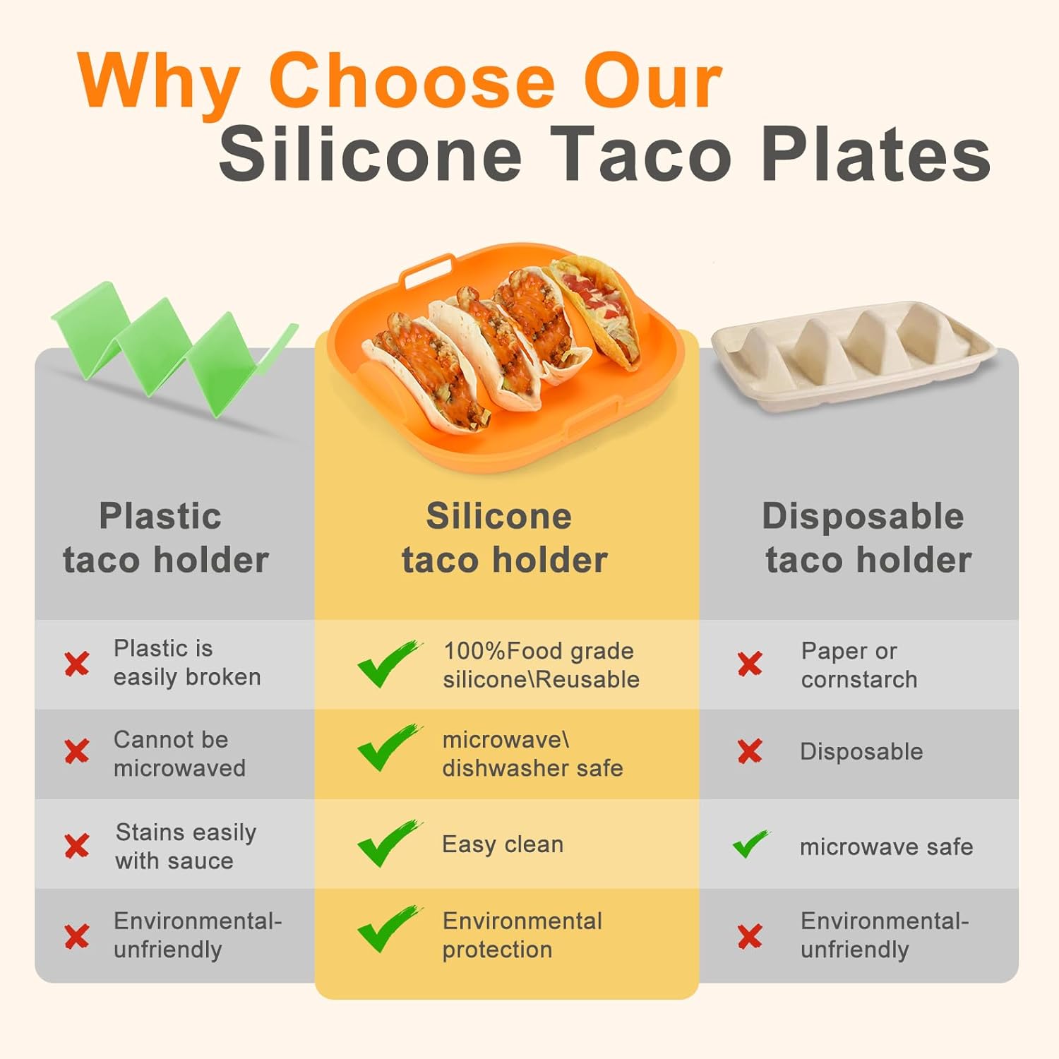 - Foodgrade Silicone Taco Holders: Our taco holders are made of 100% food-grade silicone. The Taco Plates are non-toxic, odorless, safe, environmentally friendly and reusable. Four reinforced compartments provide better support for soft or hard shell tacos, preventing fillings and sauces from spilling out, ensuring you can enjoy your tacos to the best of your ability.