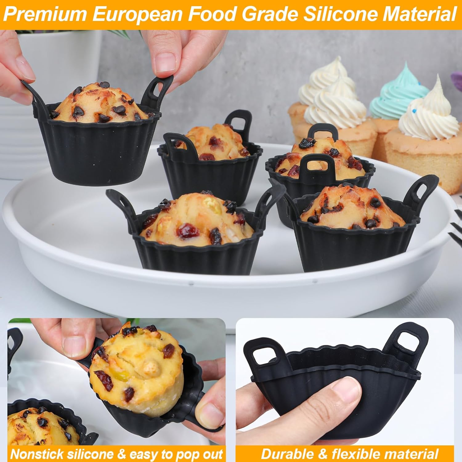 Koluti Reusable Silicone Baking Cups Set of 12, Nonstick Muffin Cupcakes Mold with Double Handle, BPA Free, Mini Round Air Fryer Cupcake Liners, Black