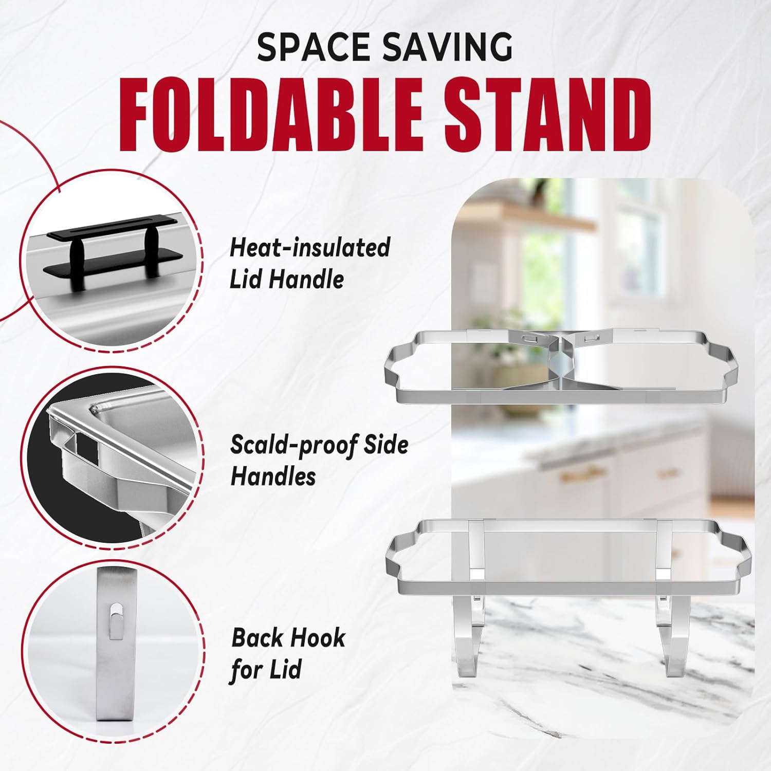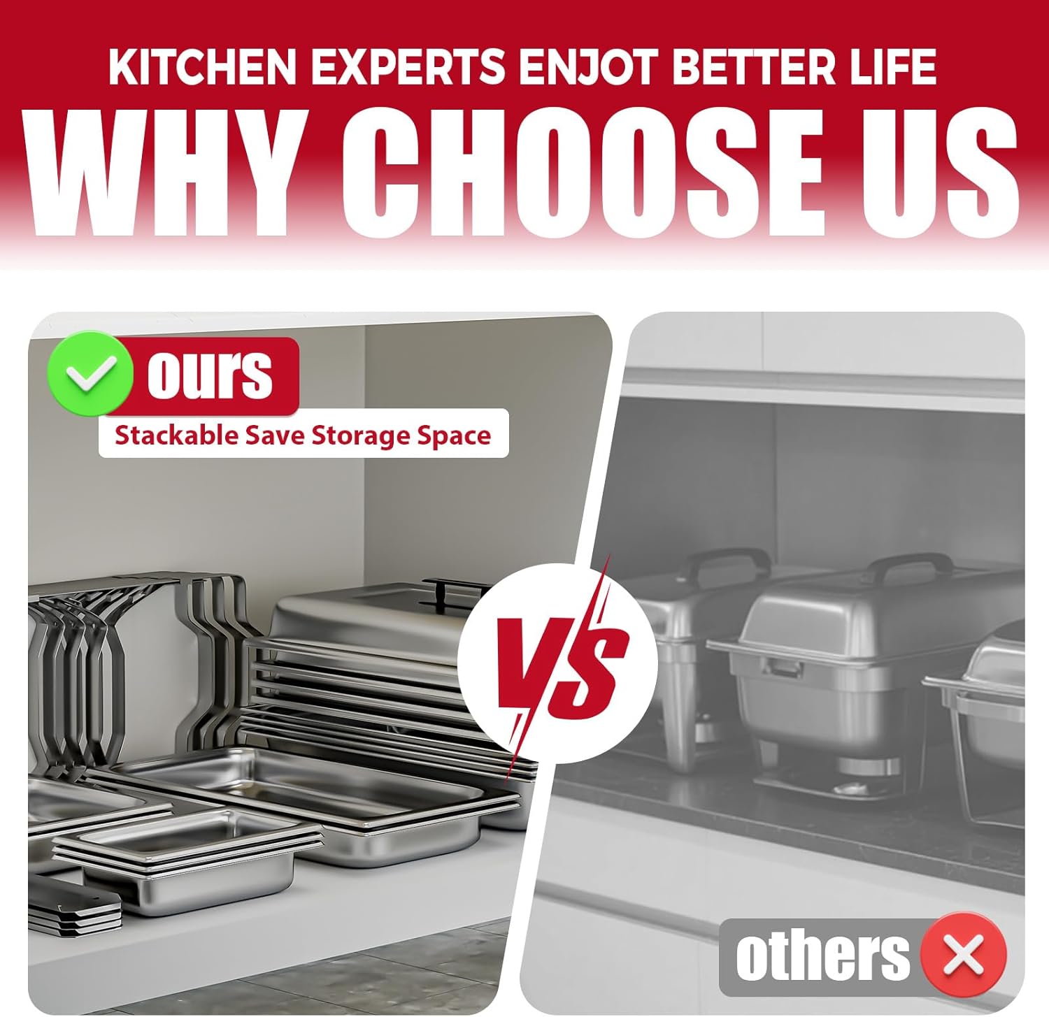 - Functional Design: No matter the heat-insulated handles or sturdy frame, it makes the chafer perform in functionality. All of the food and water pans are stackable which makes the set easy to transport and saves space for storage. Maintain your delicacyโ at the serving temperature for the buffet event with it!