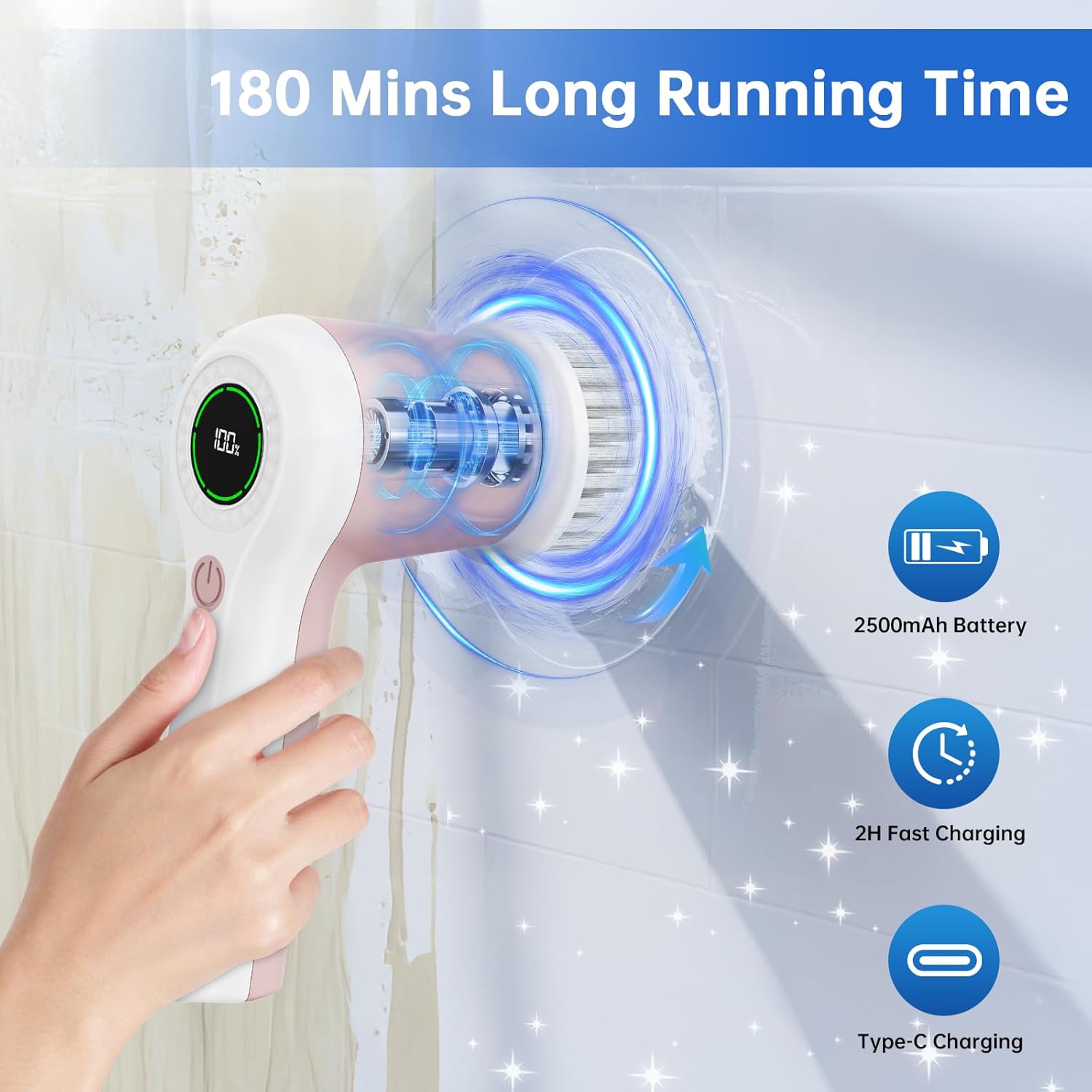 - Long Lasting Battery & Battery Level Display: Unlike other electric cleaning brushes with small batteries and short run times, our cleaning brush has a larger battery capacity. It can work continuously for 180 minutes after just a 2.5-hour fast charge. Additionally, the digital battery display clearly shows the remaining battery capacity and you will know the status of the battery , ensuring the cleaning program is not interrupted.(Power Adapter is not Included)