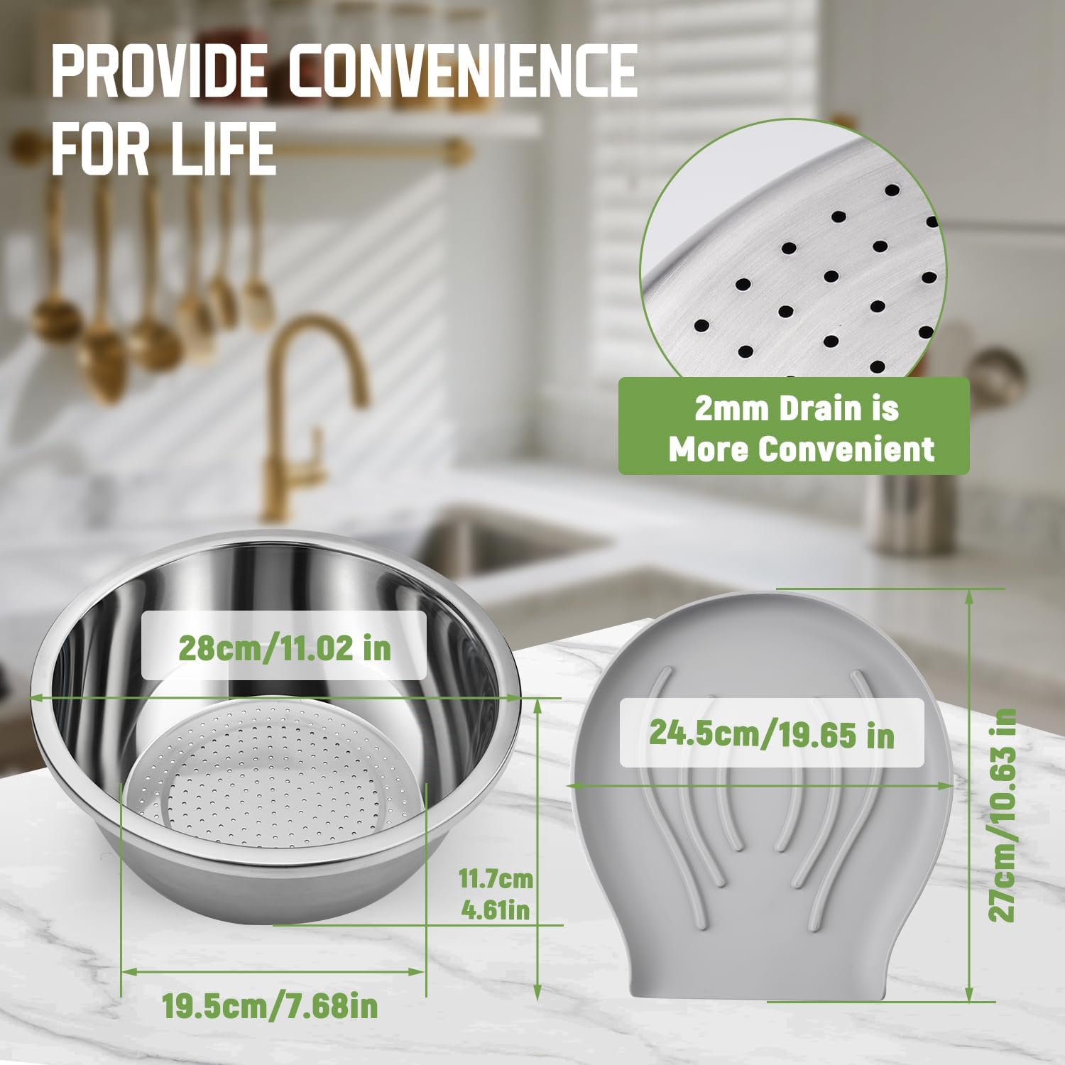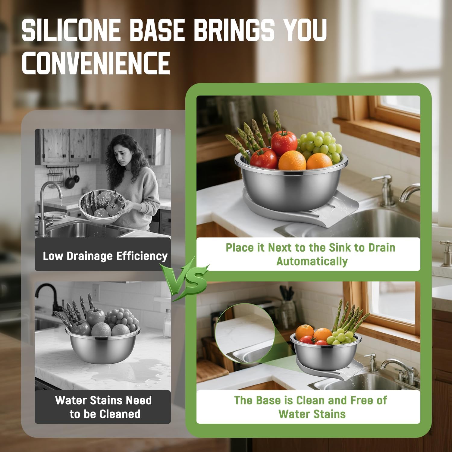 - Slip-Resistant & Protect Countertops: The food-grade silicone base provides a non-slip, secure fit while enhancing countertop protection. It's soft and flexible, conforming tightly to the base, effectively preventing slippage and vibration, preventing the colander from shifting or tipping over, while also protecting countertops from scratches and abrasions. This meticulous attention to detail embodies Goldusk's unparalleled dedication to detail