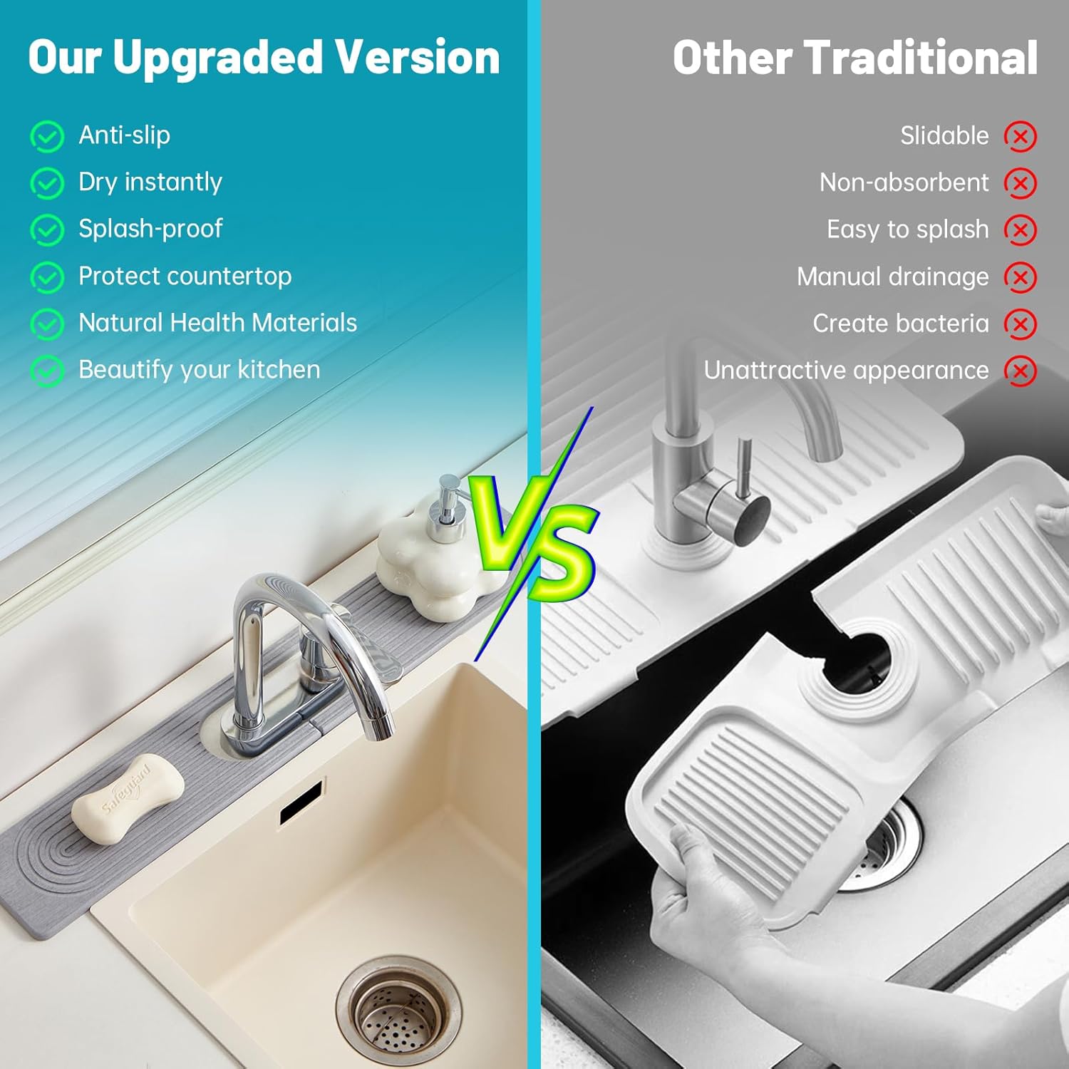 - Neat countertop: This versatile faucet mat is perfect for both your kitchen and bathroom. In the kitchen, it provides a convenient spot for your dishwashing sponges, soap, and small accessories. In the bathroom, it can hold toothbrushes, hand sanitizer, cups, and other essentials, helping you maintain a neat and clutter-free space.